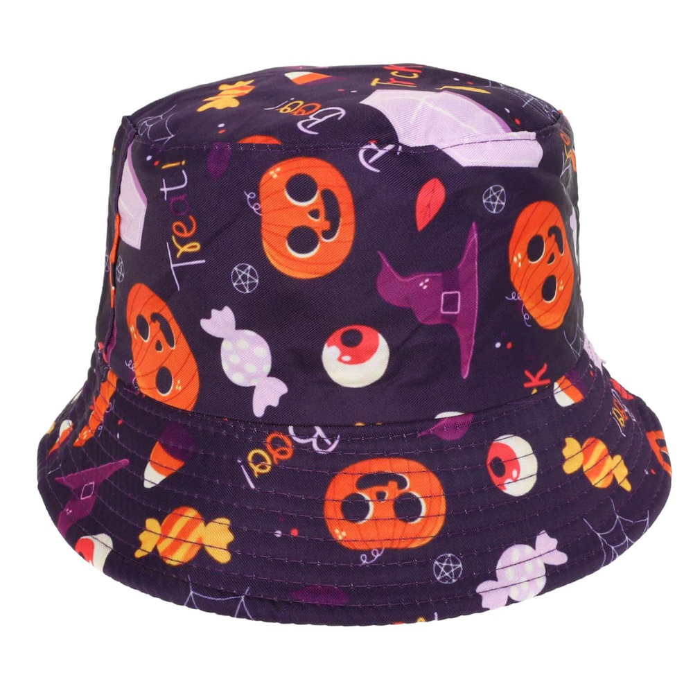 HALLOWEEN REVERSIBLE BUCKET HAT WITH ALL-OVER "TRICK OR TREAT" GRAPHIC PRINT ON COLORED FABRIC