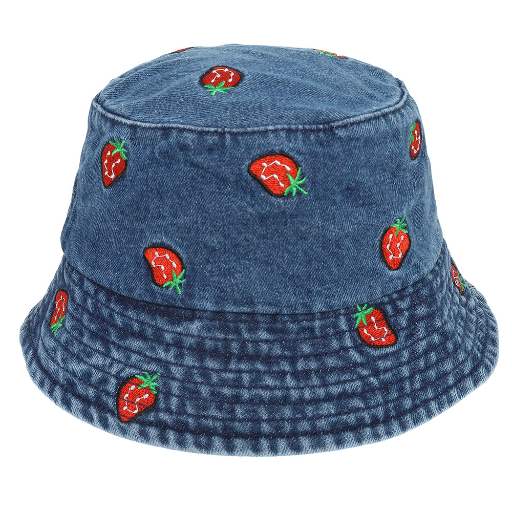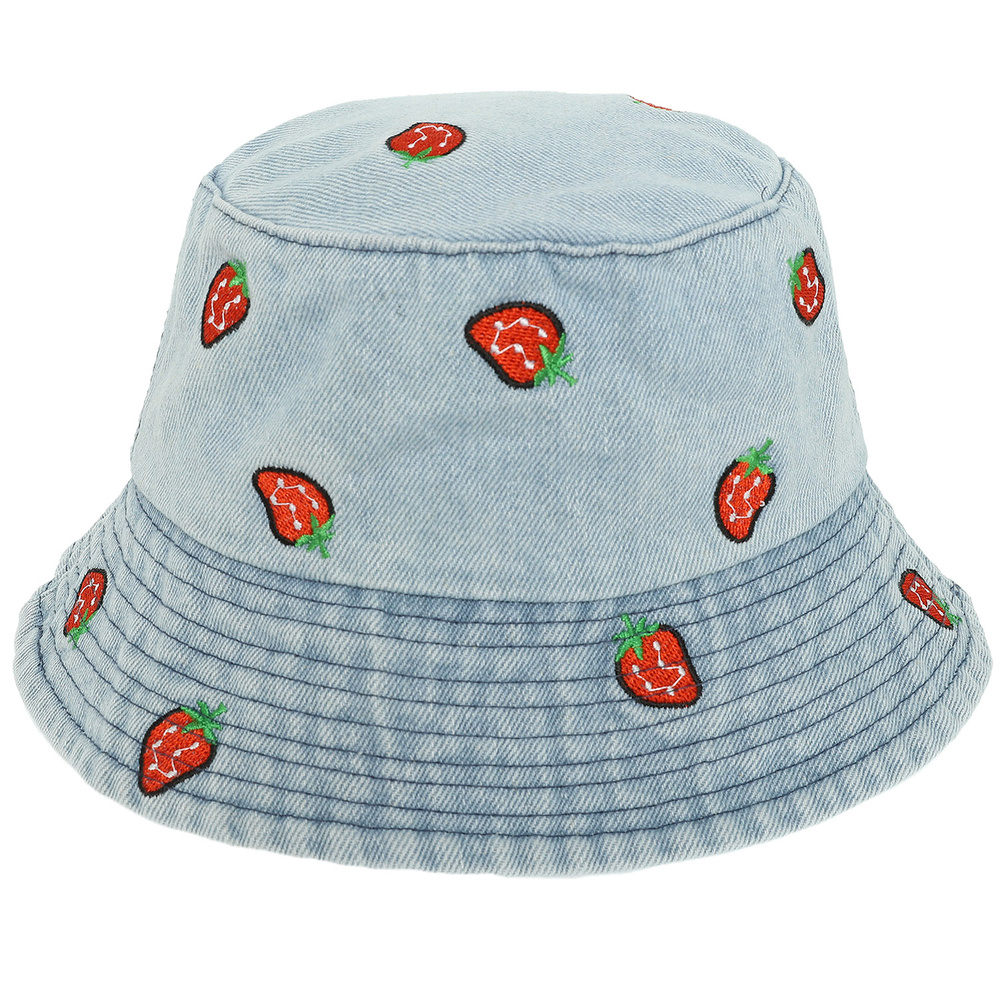 DENIM BUCKET HAT WITH EMBROIDERED STRAWBERRY ACCENTS