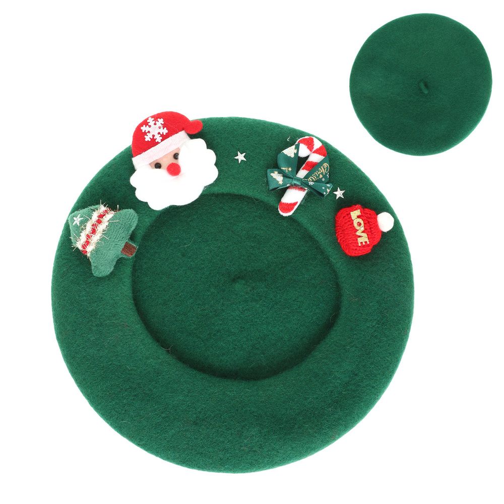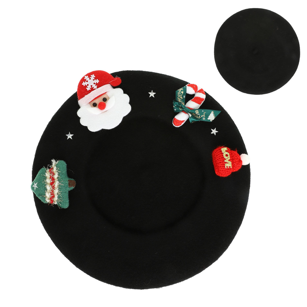 CHRISTMAS WHIMSICAL THEME FELT BERET HAT WITH EMBROIDERED HOLIDAY ICONS