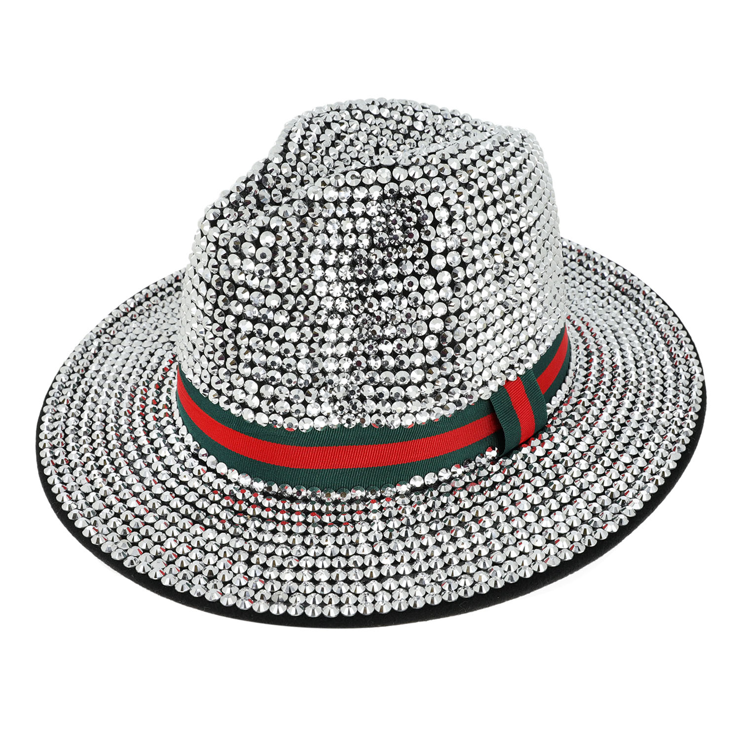 FASHION BLING RHINESTONE STUDDED WIDE BRIM FELT FEDORA HAT WITH RED GREEN STRIPE