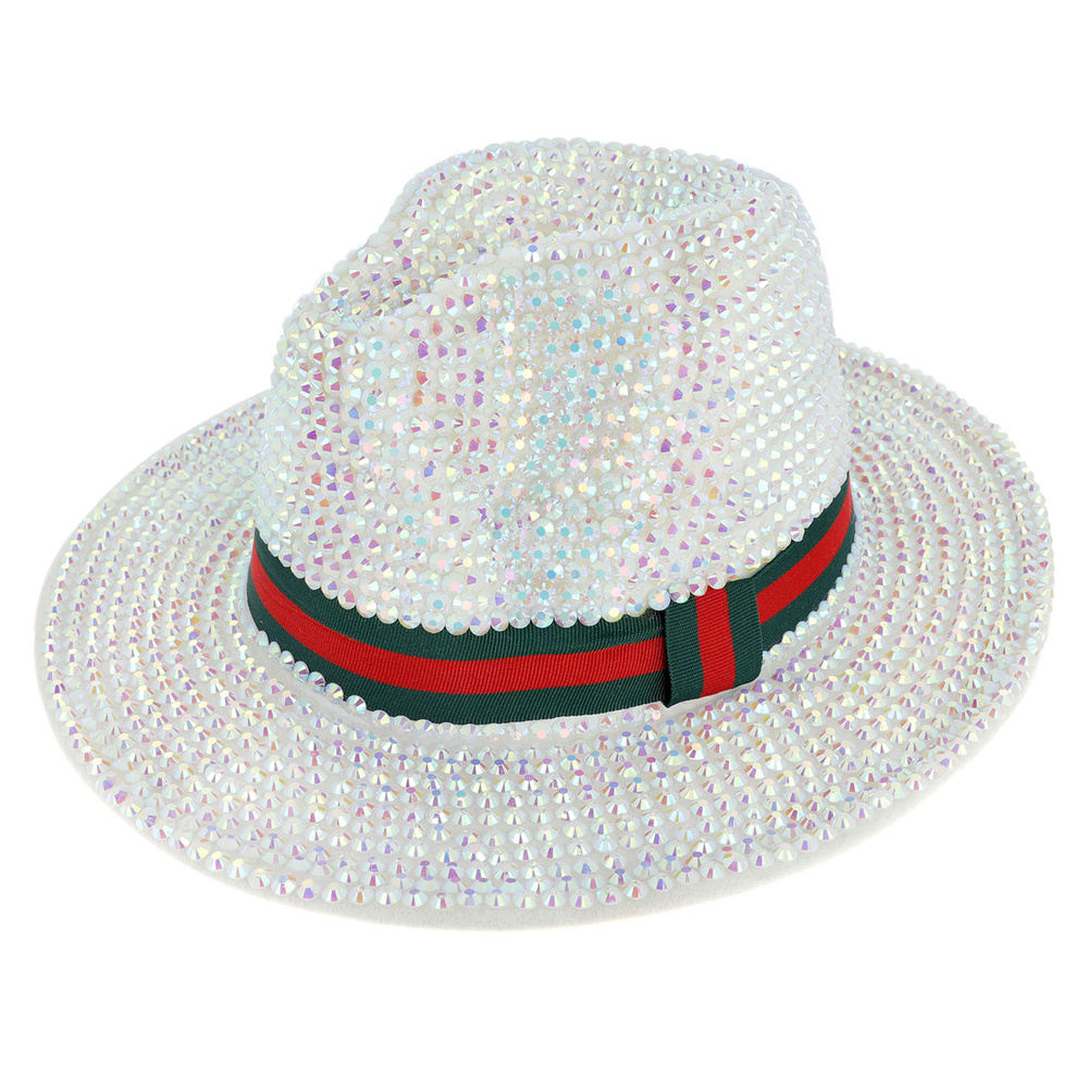 Fashion Bling Rhinestone Studded Wide Brim Felt Fedora Hat With Red Green Stripe