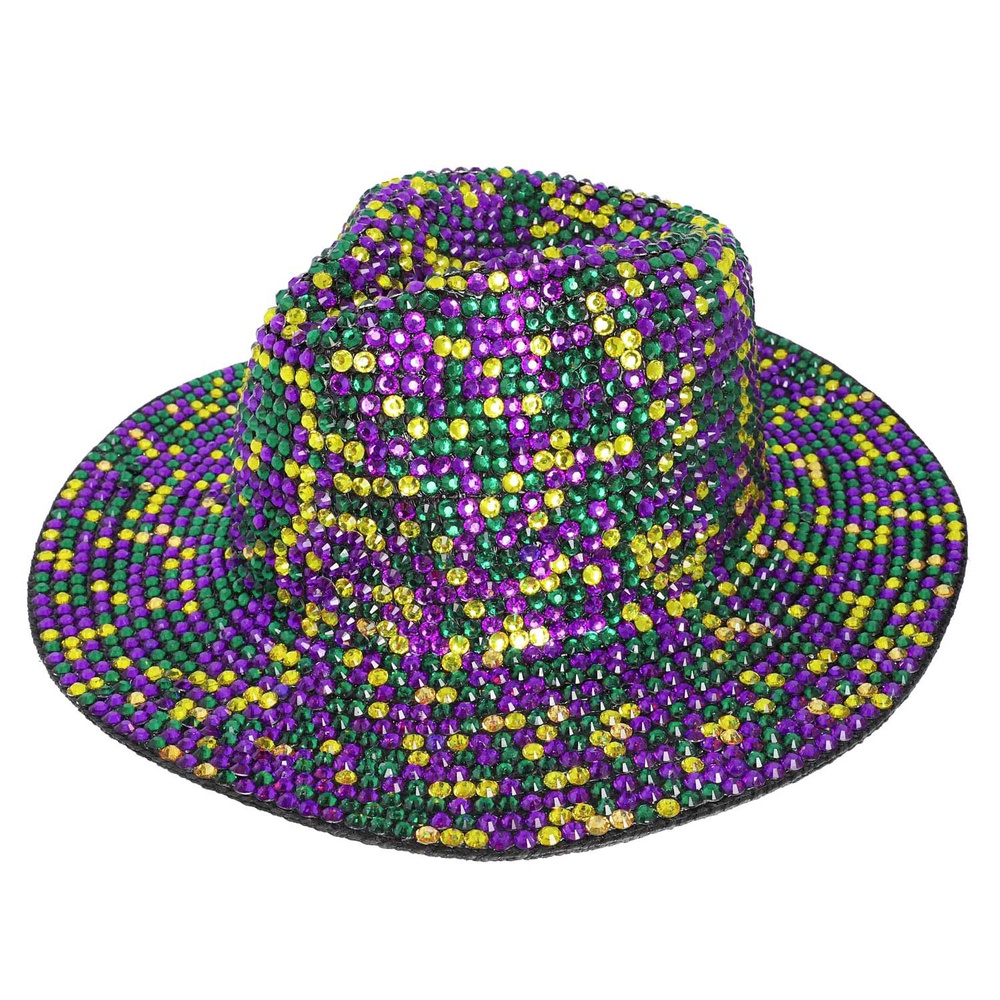 Mardi Gras Tri Color Rhinestone Wide Brim Hat