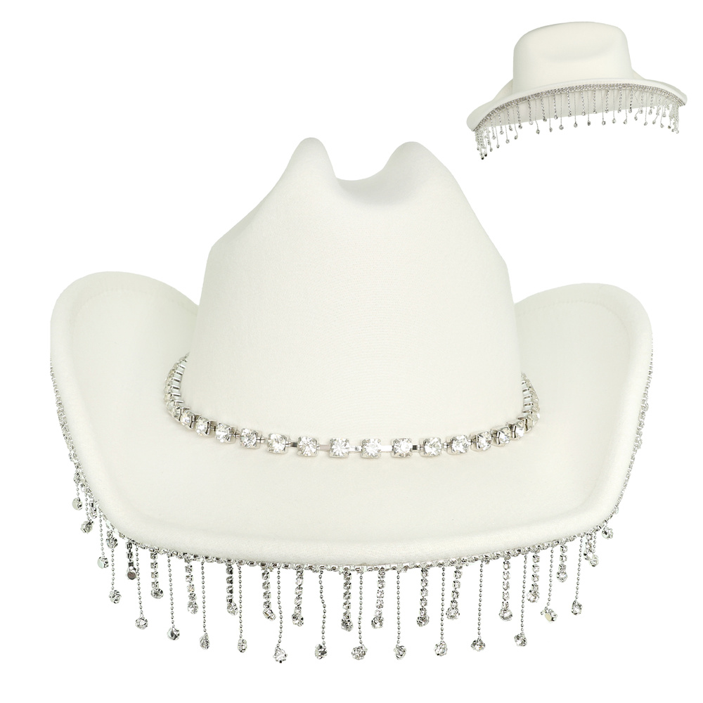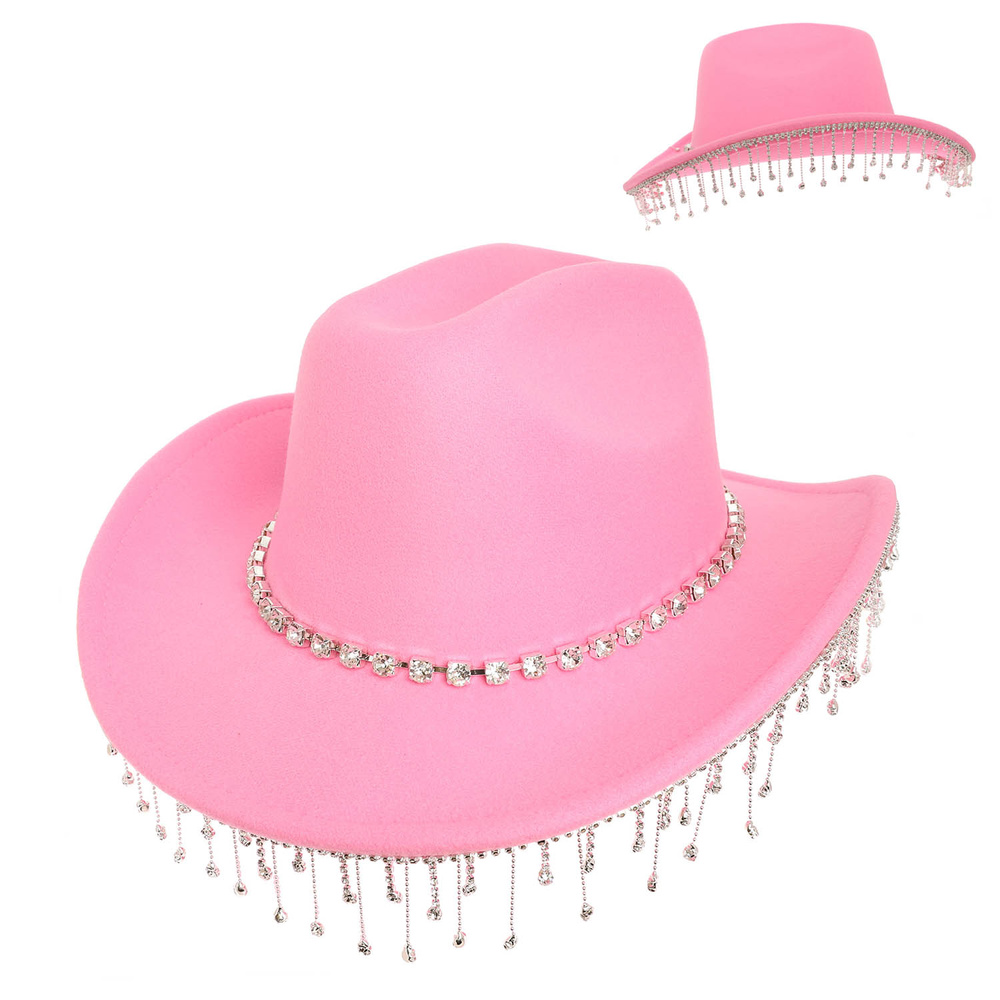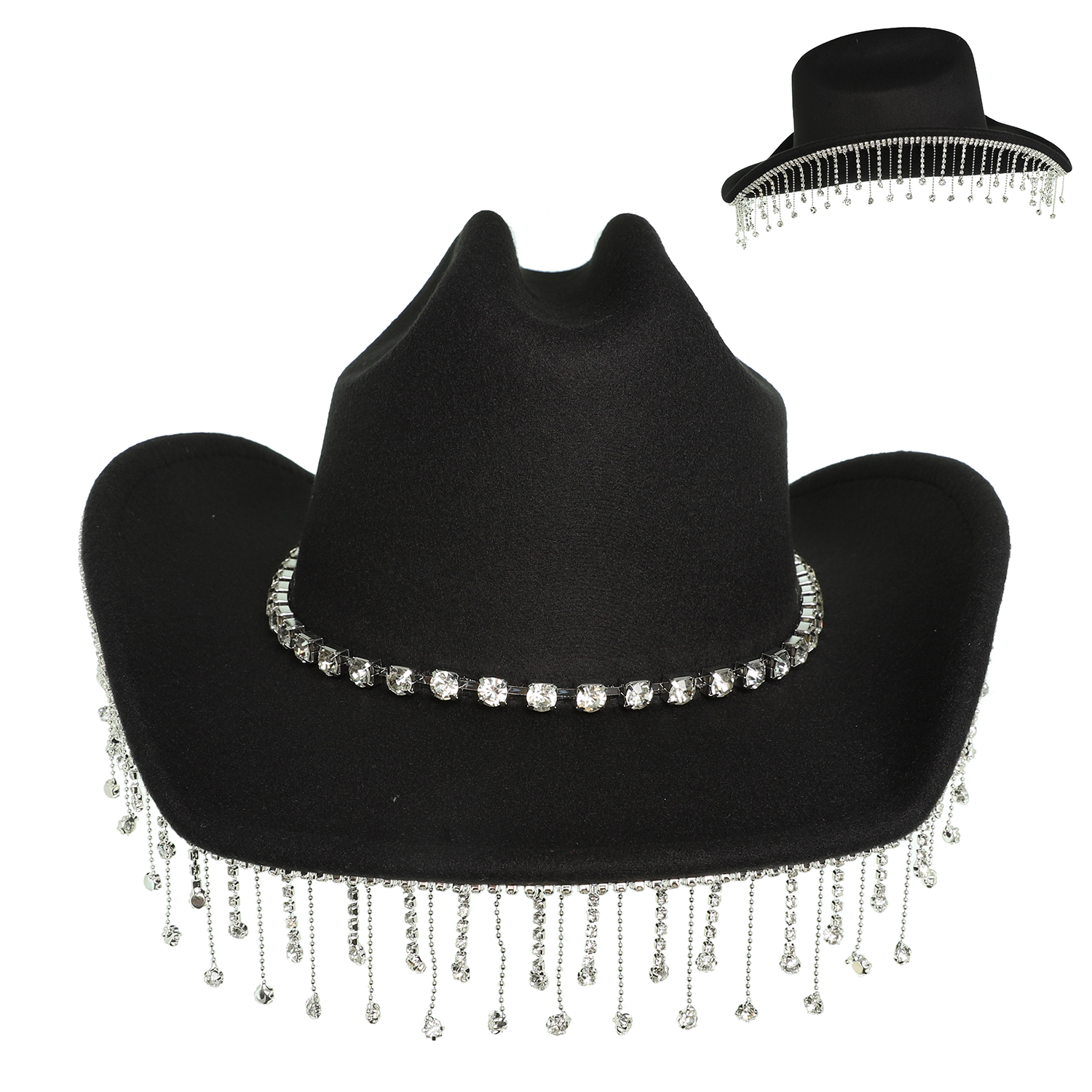 CATTLEMAN STYLED FELT COWBOY HAT WITH DECORATIVE RHINESTONES BAND AND FRINGE