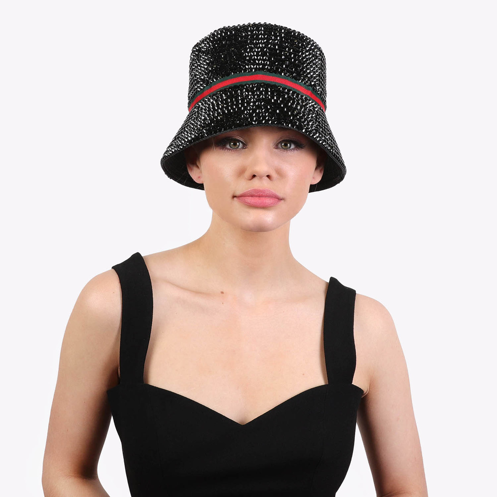 Fashion Bling Rhinestone Studded Paper Braid Bucket Hat With Red Green Stripe