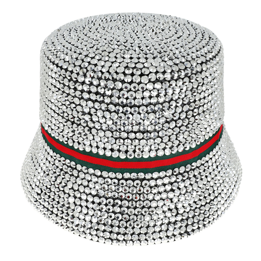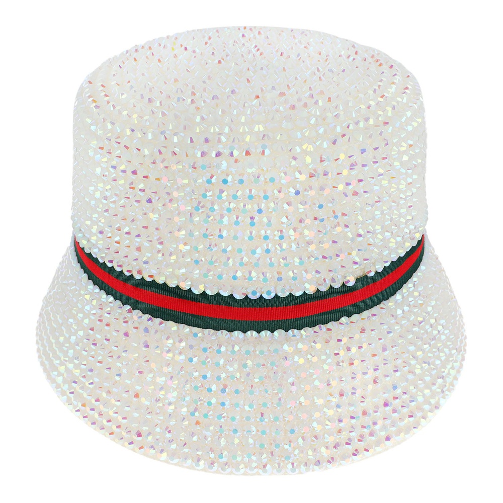Fashion Bling Rhinestone Studded Paper Braid Bucket Hat With Red Green Stripe