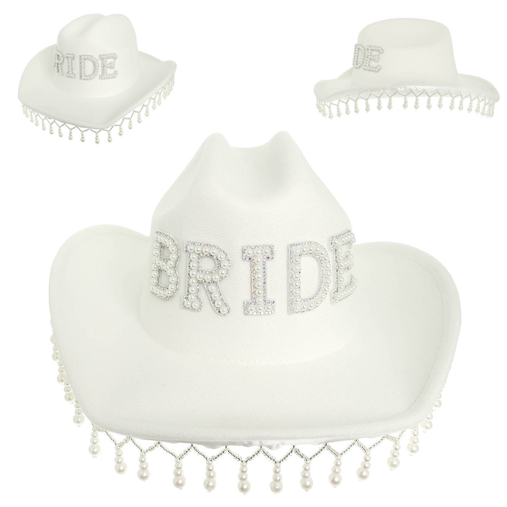 WESTERN "BRIDE" PEARL EMBELLISHED FELT COWBOY HAT WITH DECORATIVE PEARL