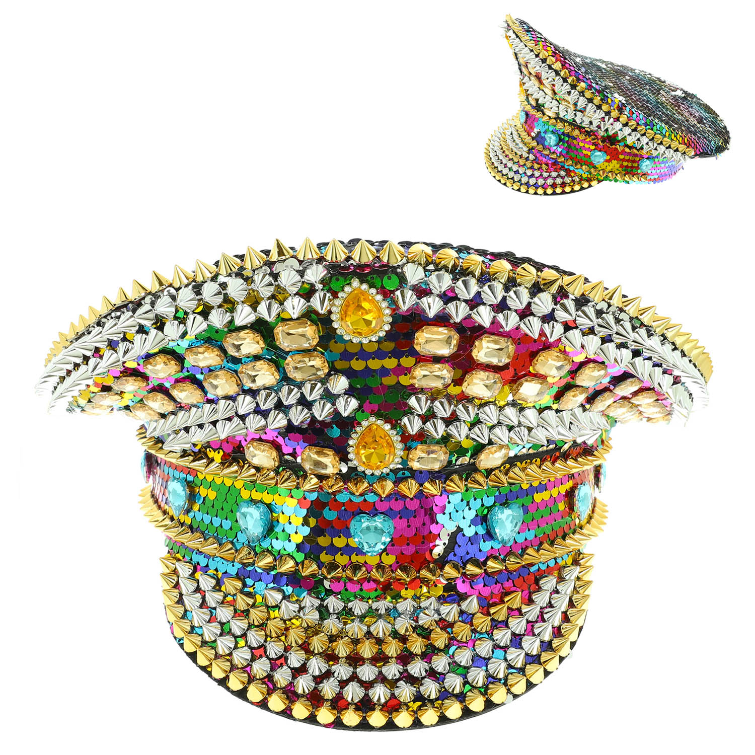 RAINBOW COLORWAY CRYSTAL RHINESTONE SEQUINS METALLIC STUD EMBELLISHED CAPTAIN HAT