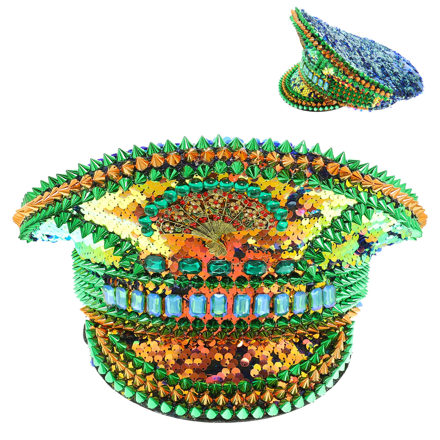 EMERALD GREEN CRYSTAL RHINESTONE SEQUINS METALLIC STUD EMBELLISHED PEACOCK CAPTAIN HAT