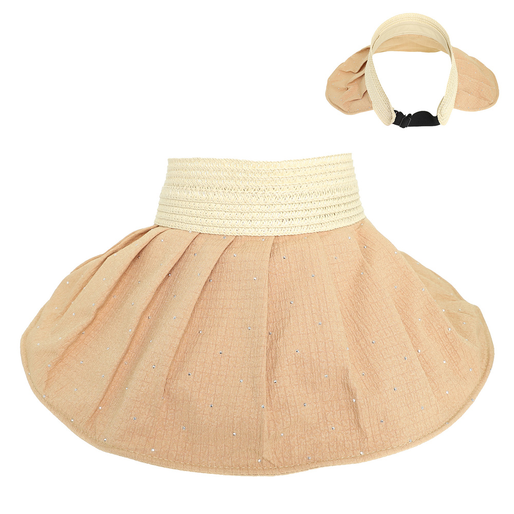 RHINESTONE STUDDED WIDE DOWN BRIM FABRIC SUN VISOR HAT WITH STRAW WOVEN BAND