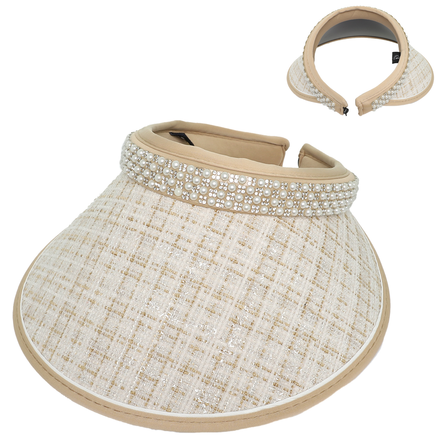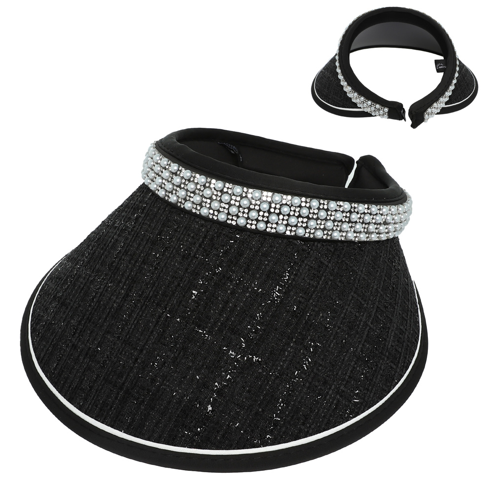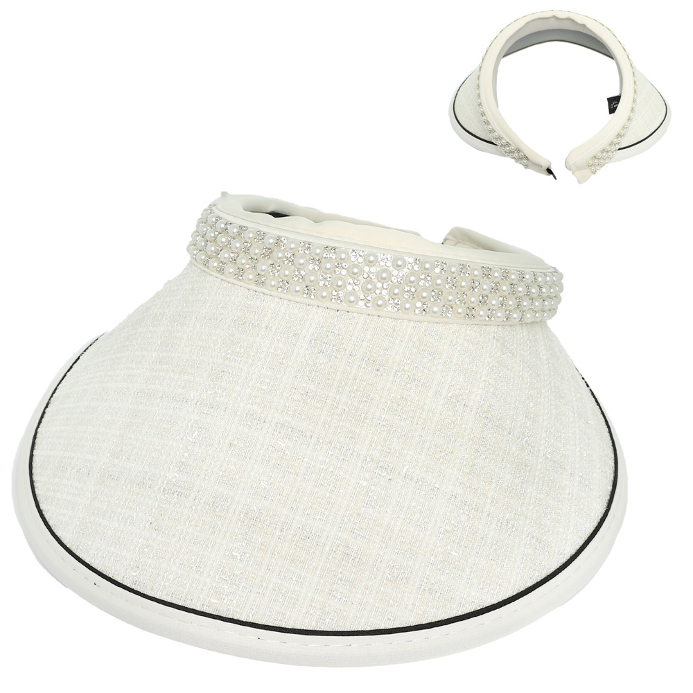 FABRIC SUN VISOR HAT WITH PEARL RHINESTONE EMBELLISHED BAND