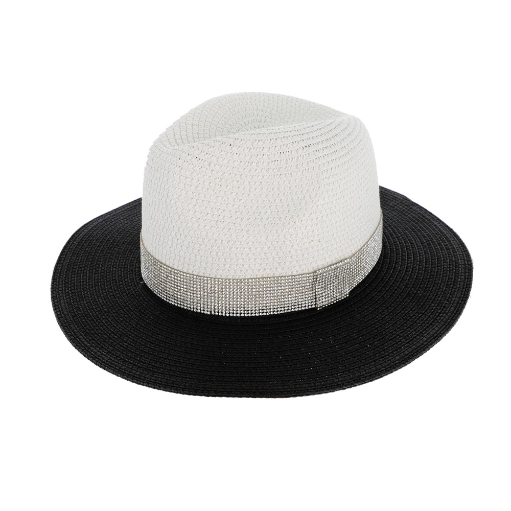Two Tone Panama Fedora Paper Braid Hat With Crystal Rhinestone Band
