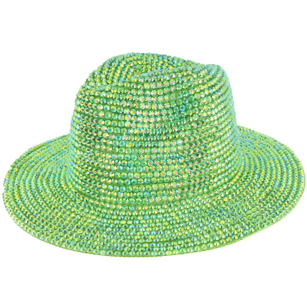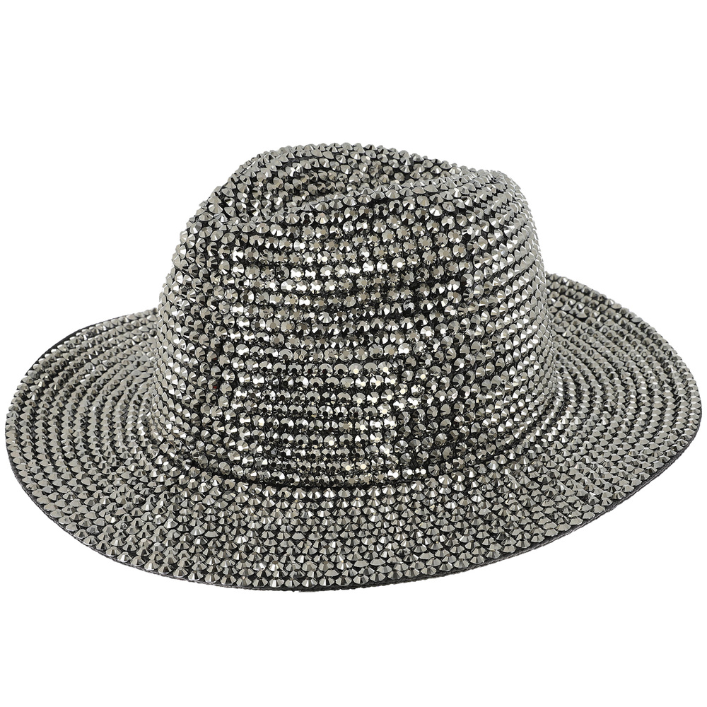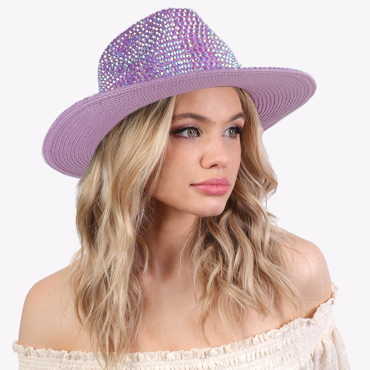 Rhinestone Studded Wide Brim Paper Braid Fedora Hat