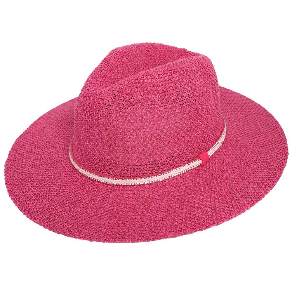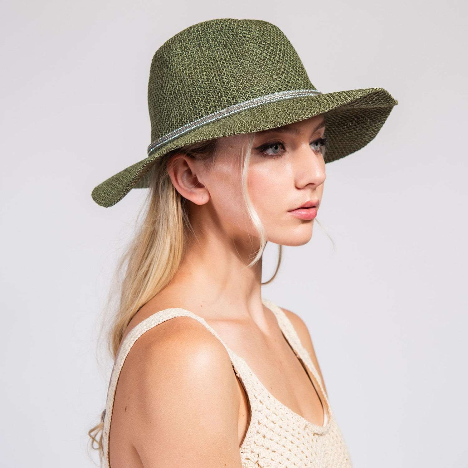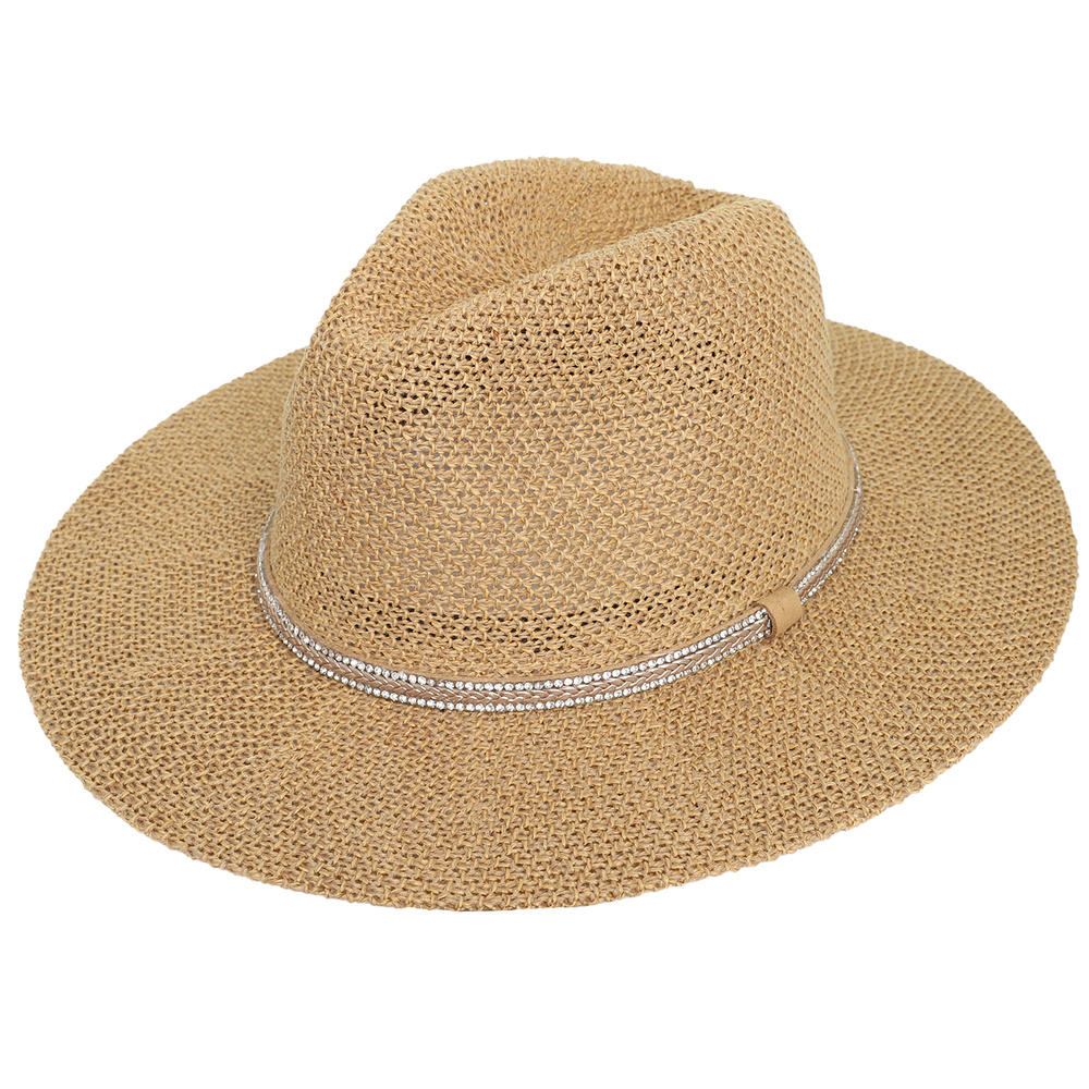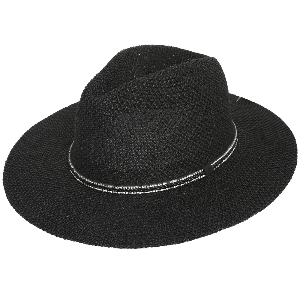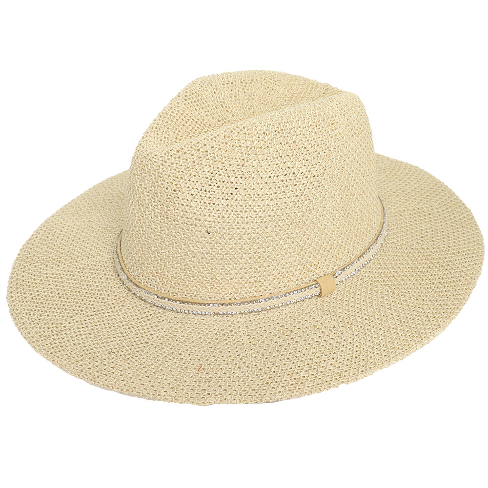 WIDE BRIM PAPER BRAID PANAMA HAT WITH RHINESTONE DECORATIVE BAND
