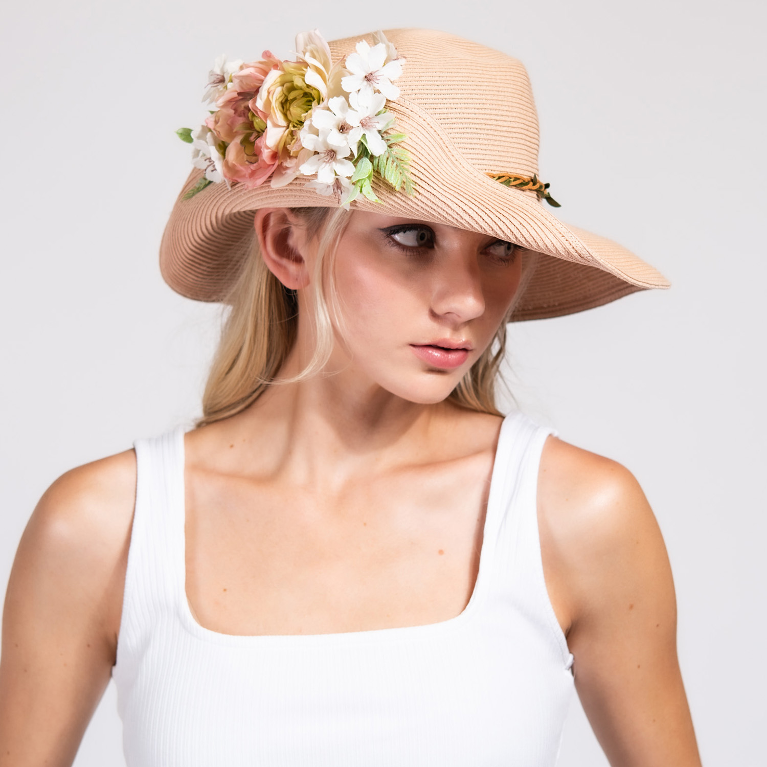 WIDE BRIM PAPER BRAID SUN HAT WITH FLORAL HAT BAND