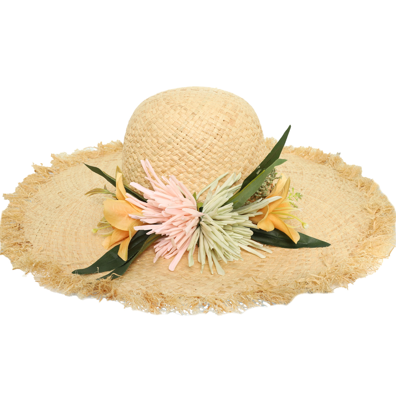 FLAT WIDE BRIM STRAW RAPHIA HAT WITH FRAY EDGES AND FLORAL HAT BAND