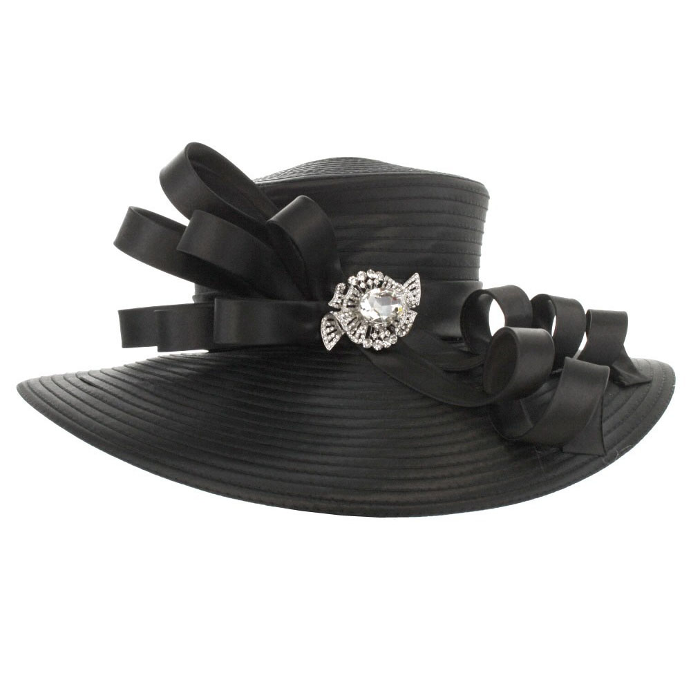 Large Satin Braid Hat with Curly Bow and Stone Brooch