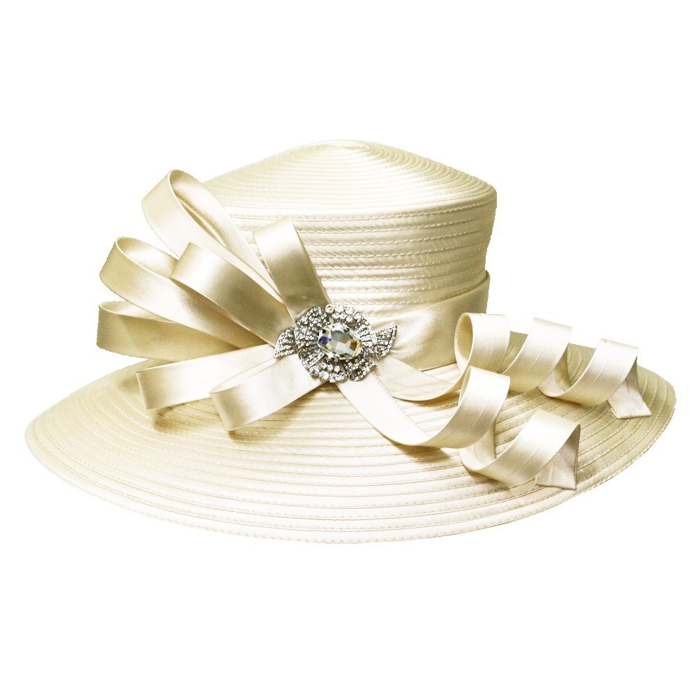 Large Satin Braid Hat with Curly Bow and Stone Brooch