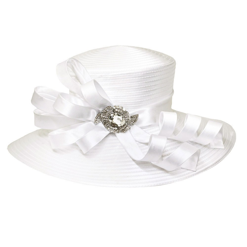 Large Satin Braid Hat with Curly Bow and Stone Brooch