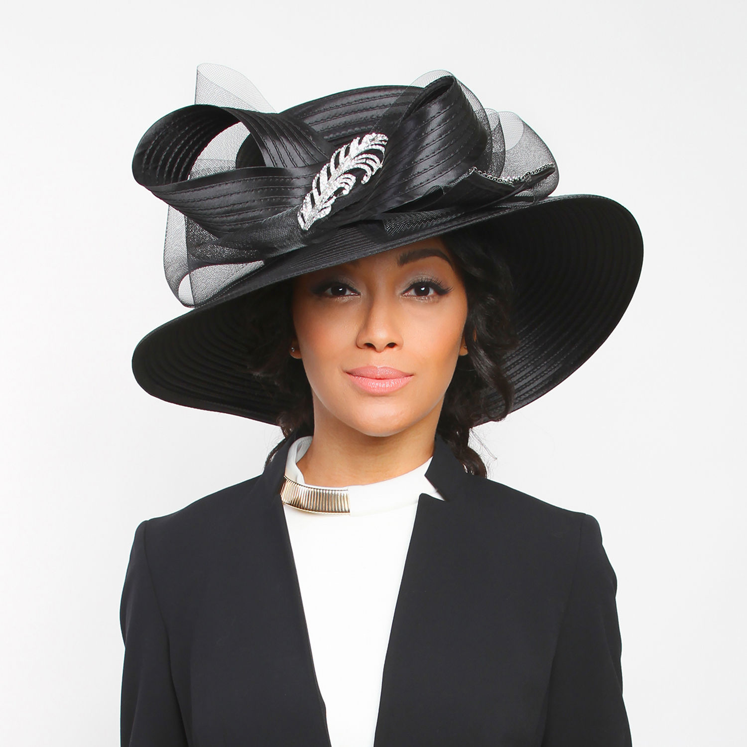 Wide Brim Satin Braid Hat with Mesh Bow and Stone Leaf Accent