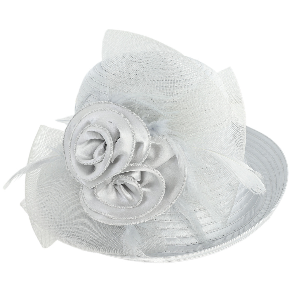 Small Brim Church Braid Hat With Double Flowers, Feather And Mesh Bow