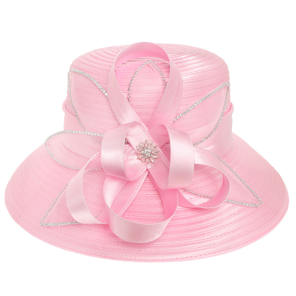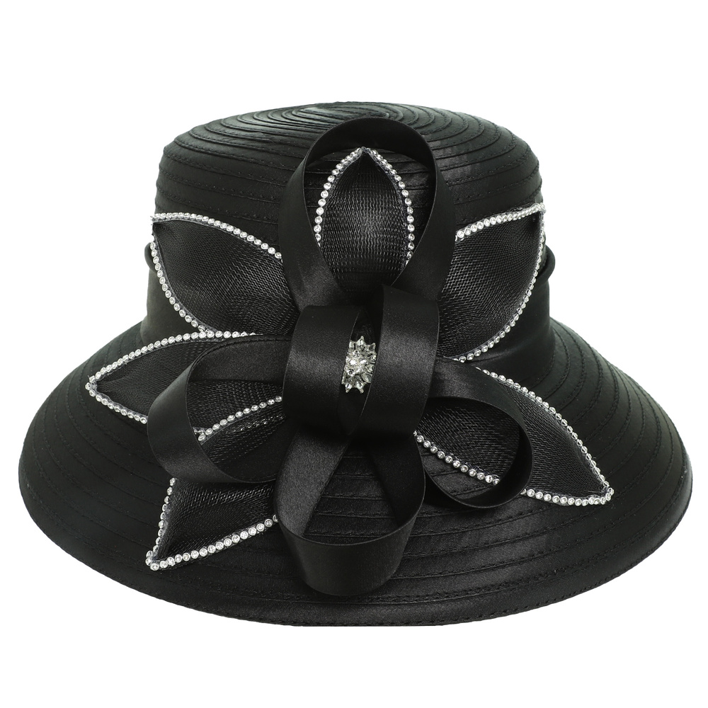 CRYSTAL RHINESTONE EMBELLISHED FLORAL LOOPED RIBBON BOW DOWN BRIM BRAID HAT