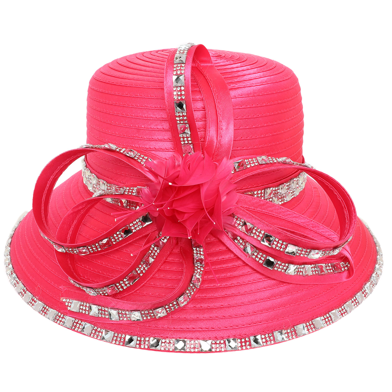 FEATHER CRYSTAL RHINESTONE EMBELLISHED LOOPY BOW SATIN BRAID DOWN BRIM HAT