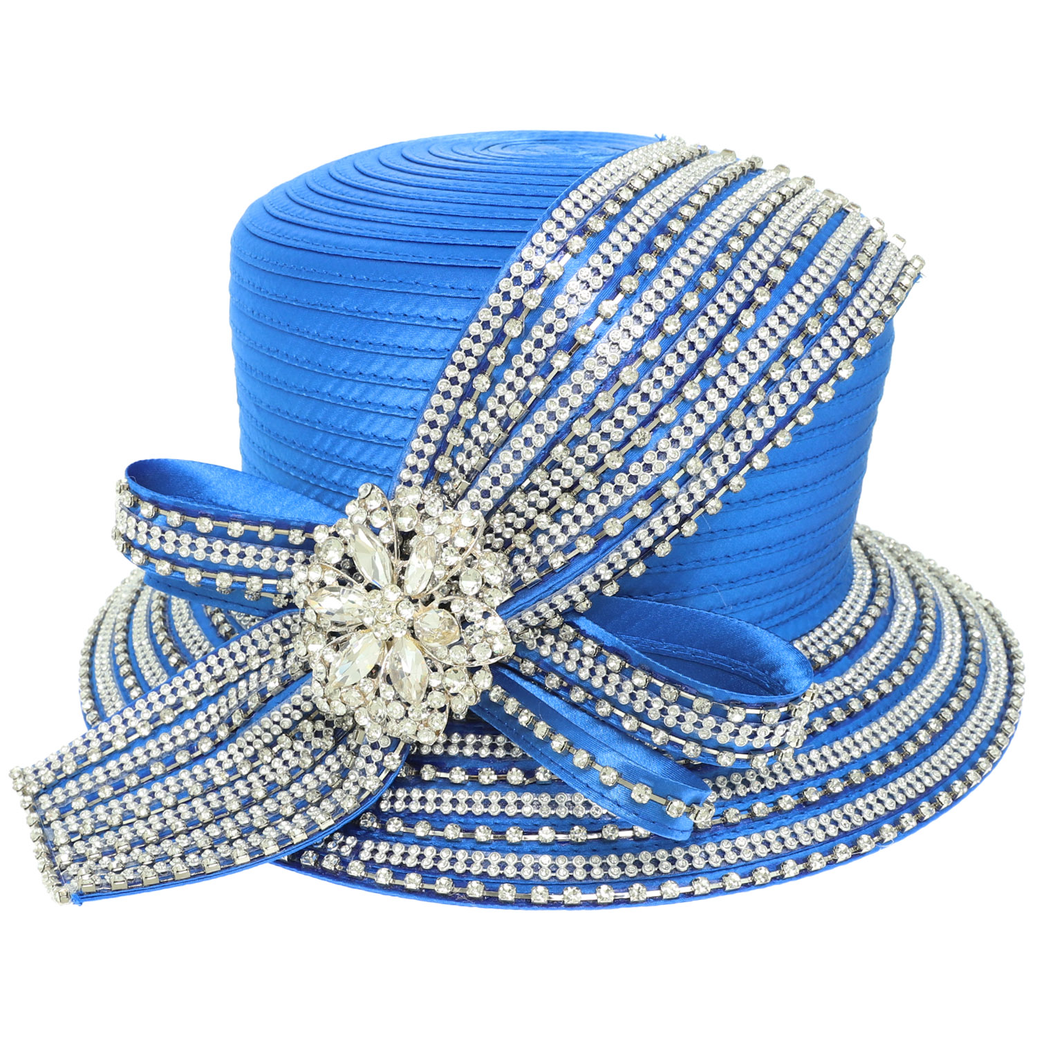 DOWN BRIM PAPPER BRAID HAT WITH CRYSTAL RIBBON AND JEWELED TRIM DETAIL