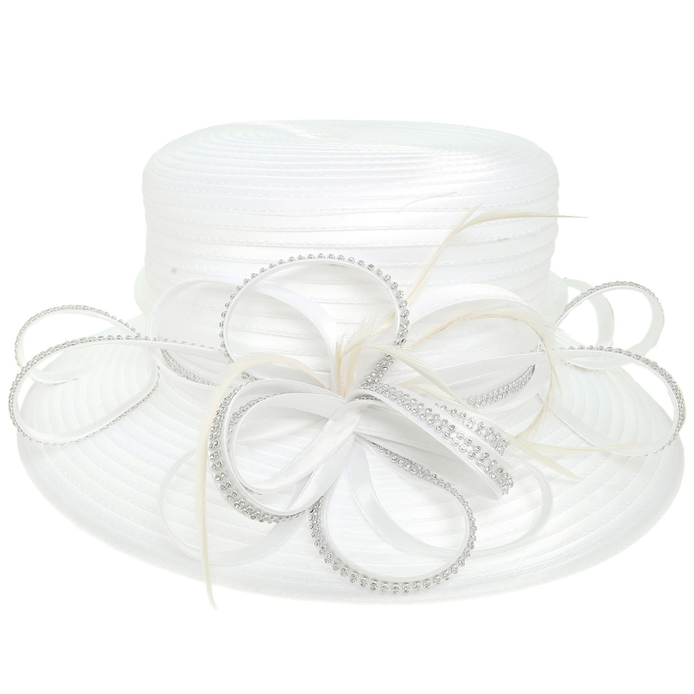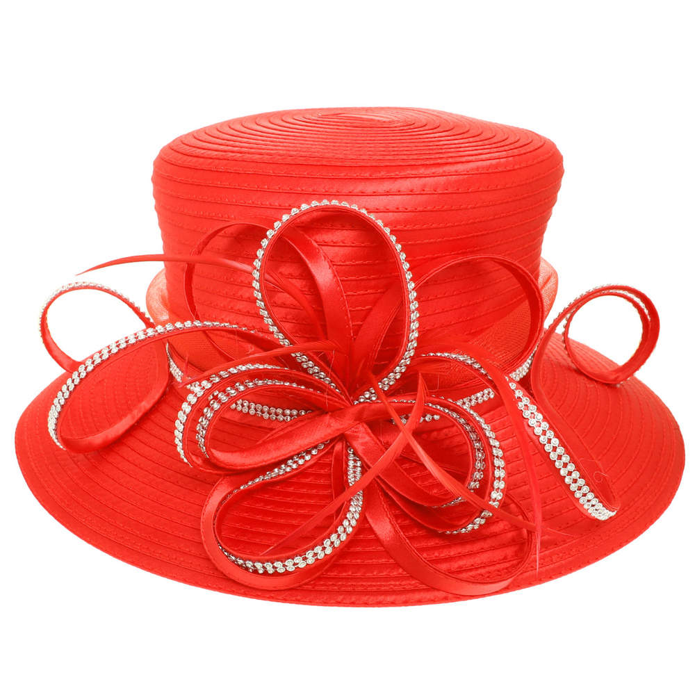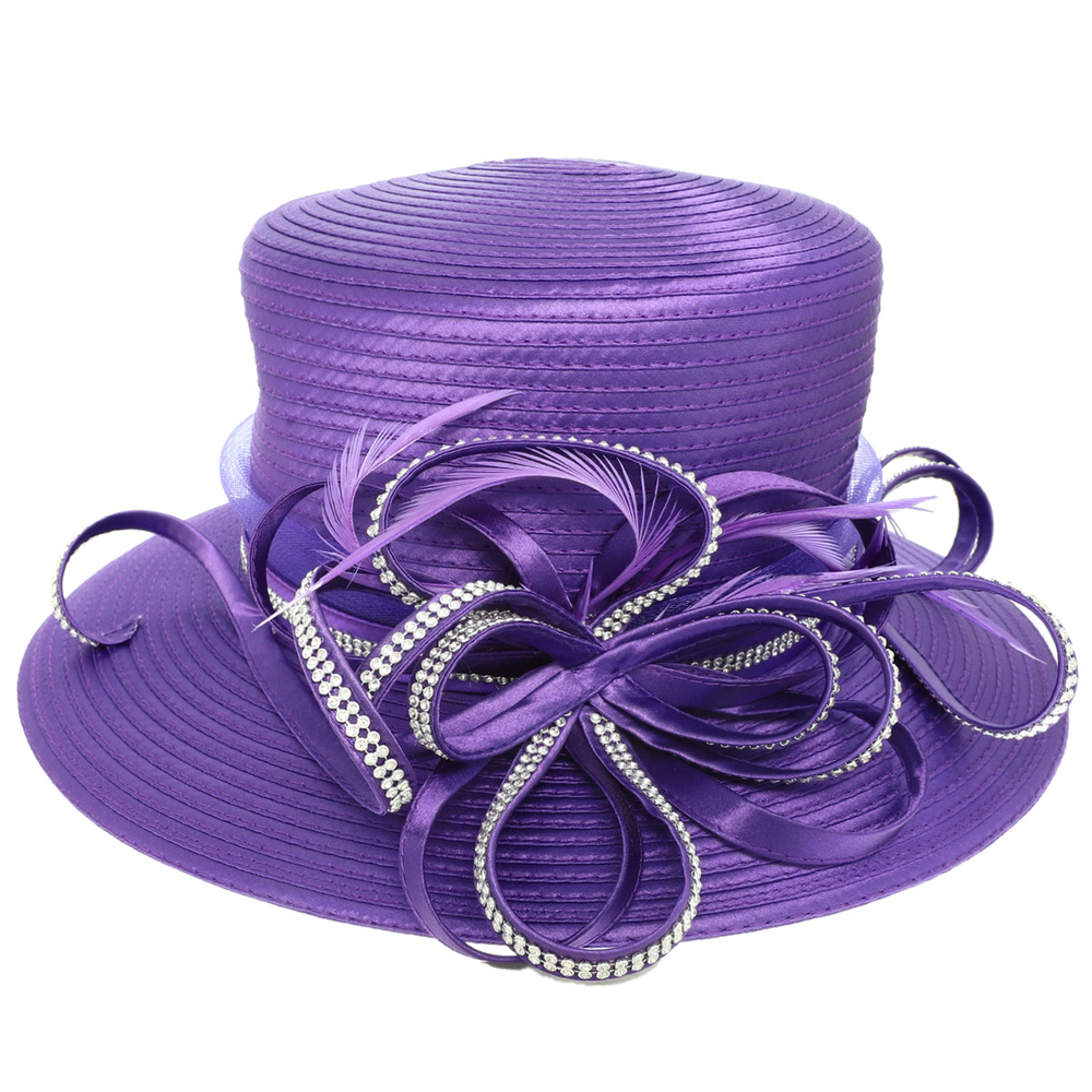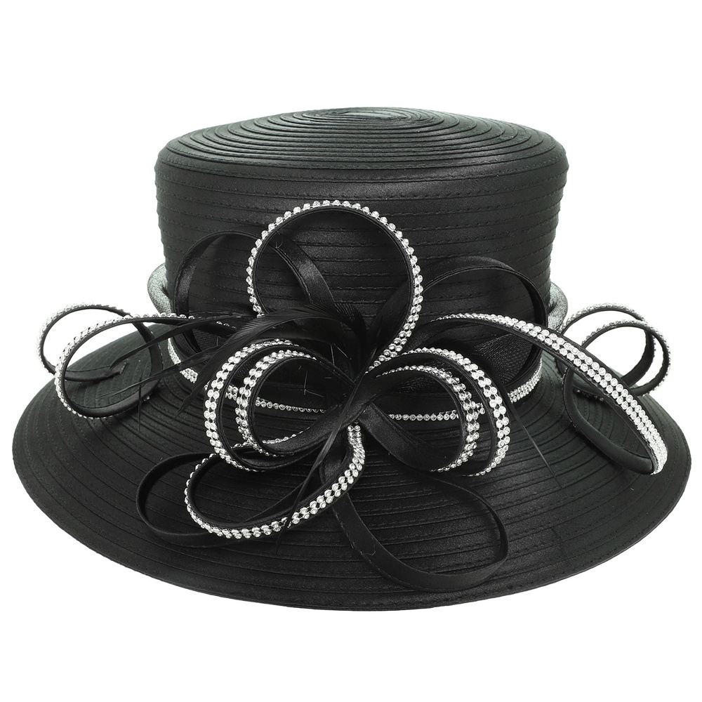 DOWN BRIM PAPPER BRAID HAT WITH DECORATIVE RHINESTONE RIBBON LOOPS AND FEATHER ACCENT DETAIL