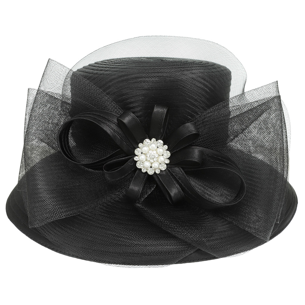 PAPER BRAID HAT WITH PEARL RHINESTONE CLUSTER ORGANZA MESH RIBBON