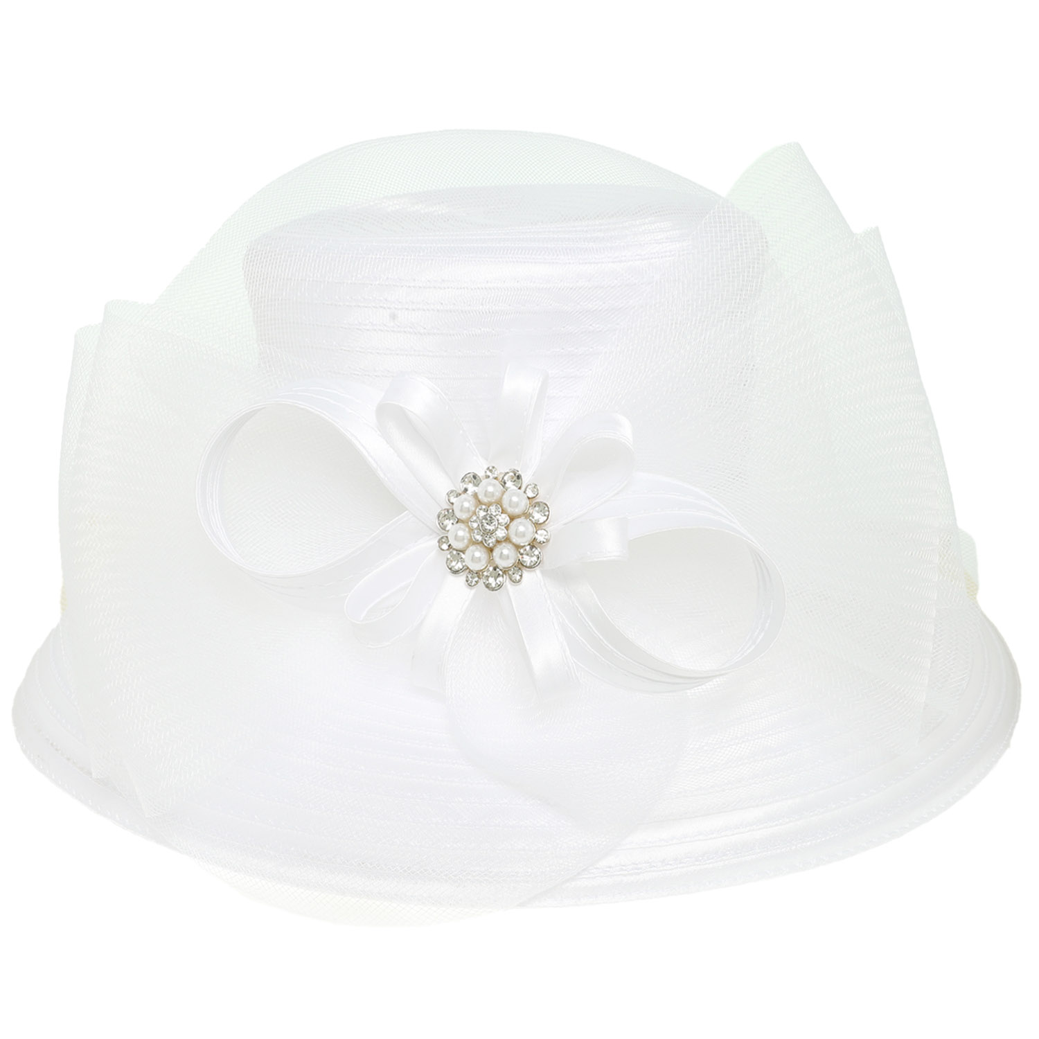 PAPER BRAID HAT WITH PEARL RHINESTONE CLUSTER ORGANZA MESH RIBBON
