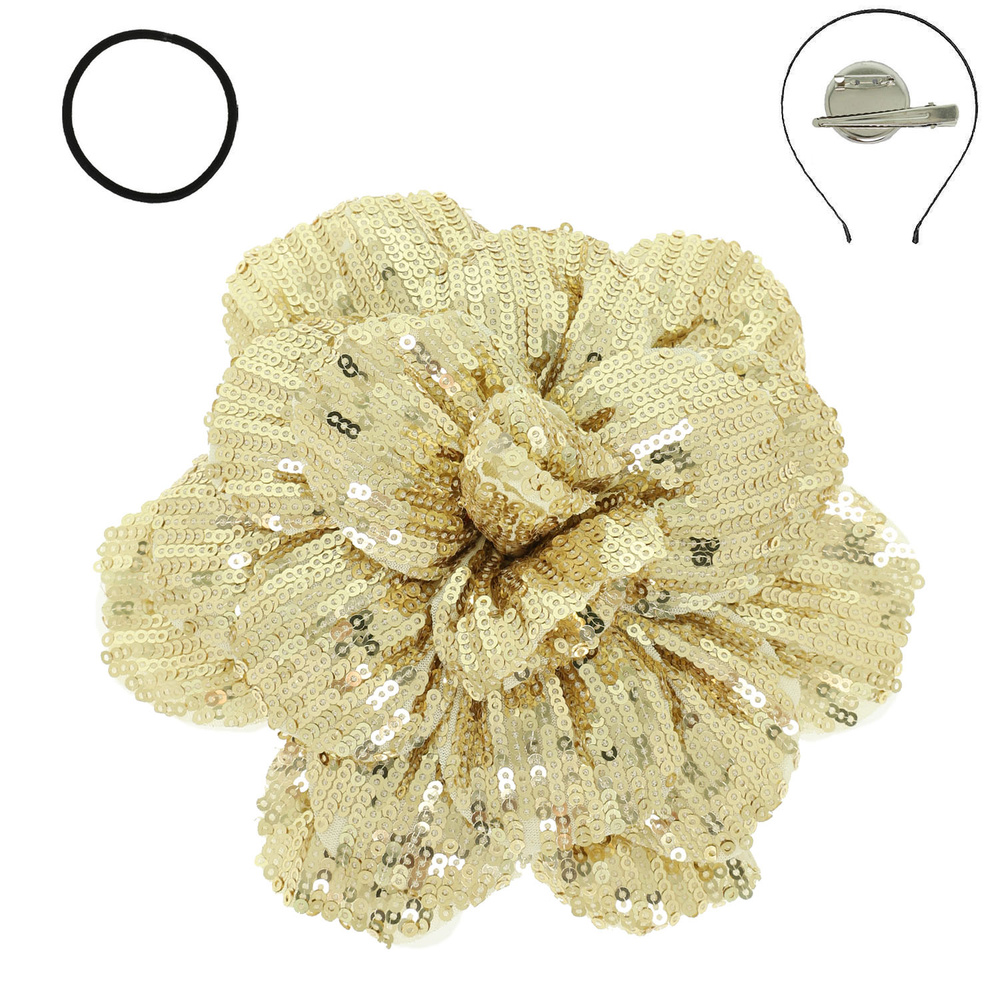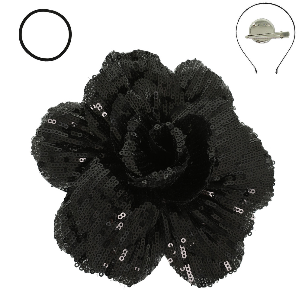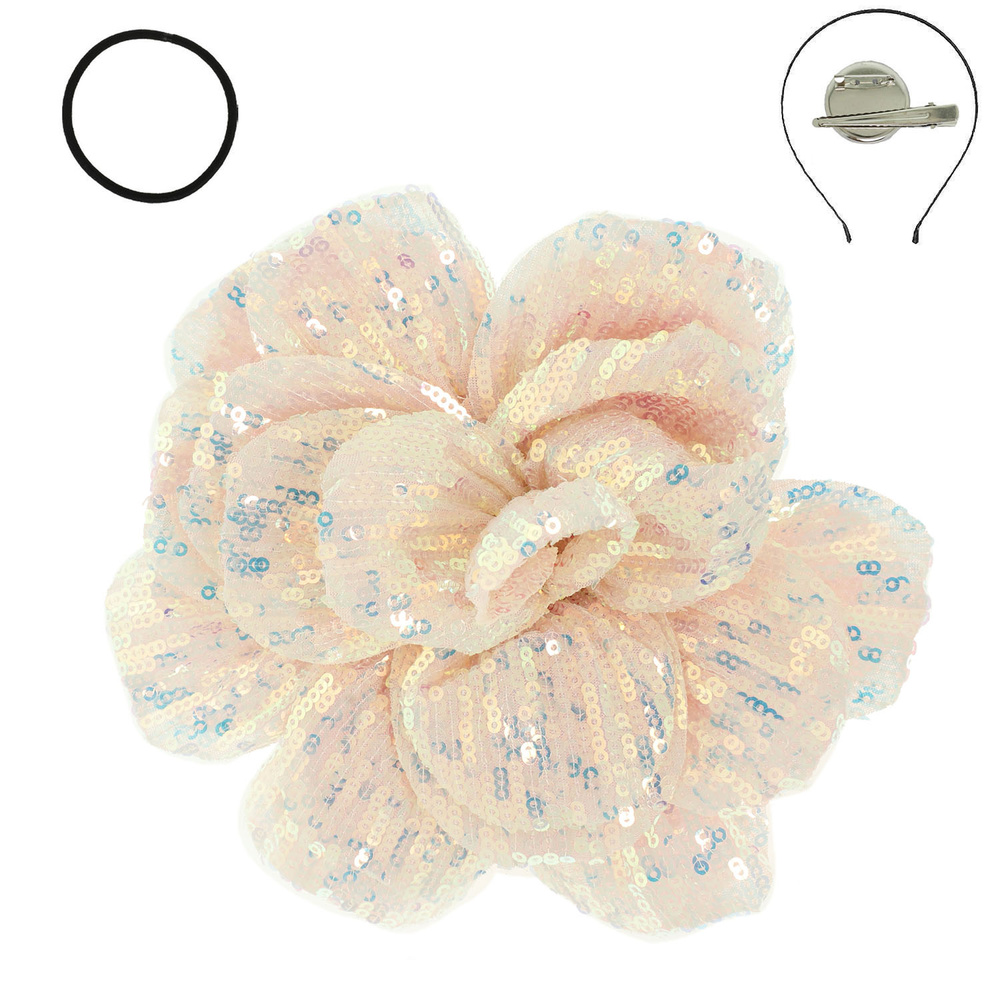 3-IN-1 SEQUIN ROSE BLOOM FASCINATOR WITH HEADBAND HAIR TIE AND CLIP BACKINGS
