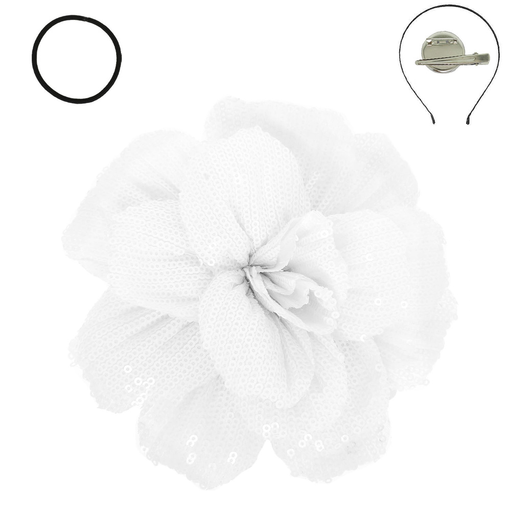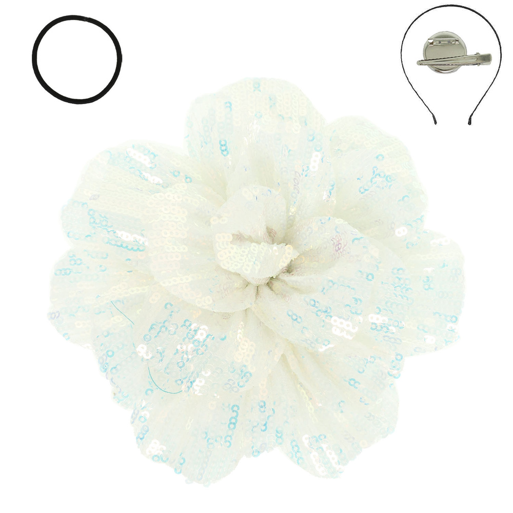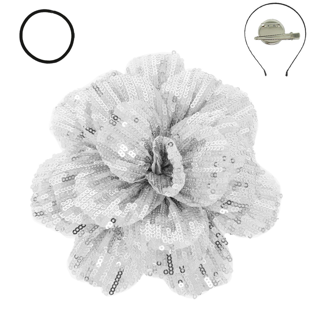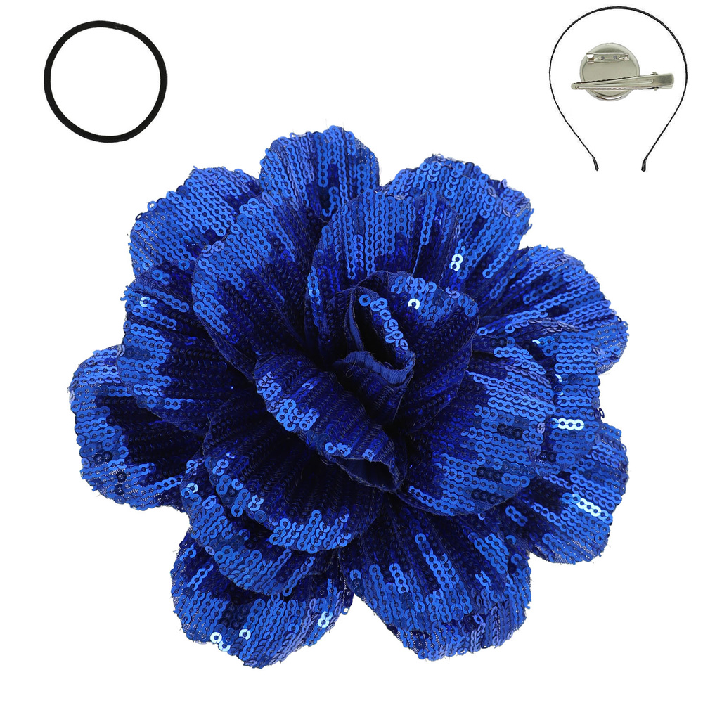 3-IN-1 SEQUIN ROSE BLOOM FASCINATOR WITH HEADBAND HAIR TIE AND CLIP BACKINGS
