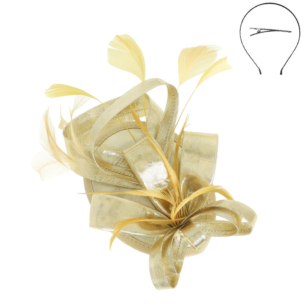 FEATHERED LOOPY BOW SINAMAY DISC FASCINATOR WITH ALLIGATOR HAIR CLIP AND HEADBAND