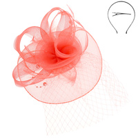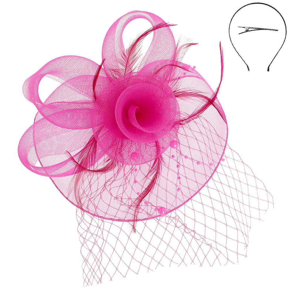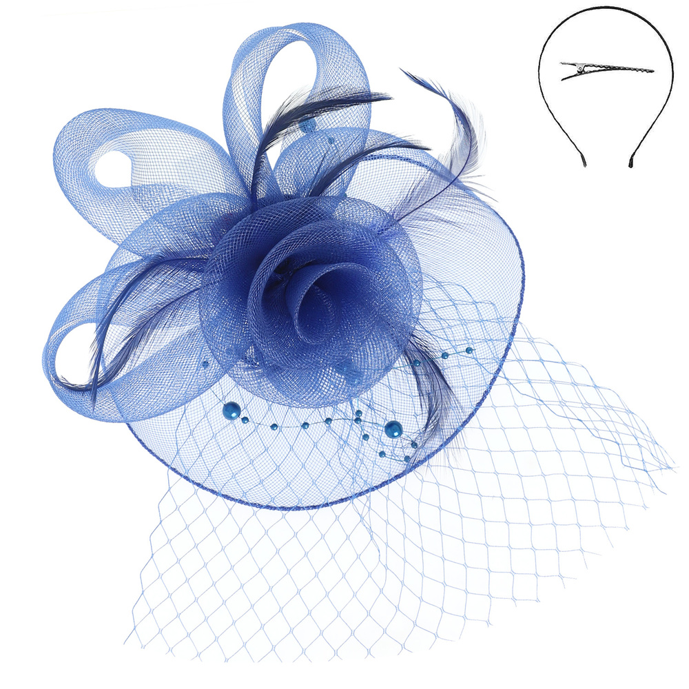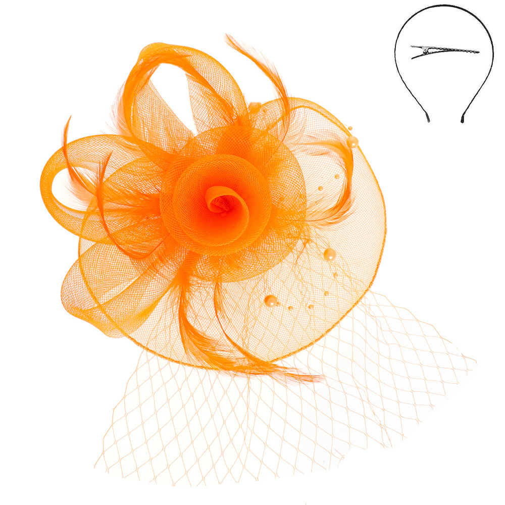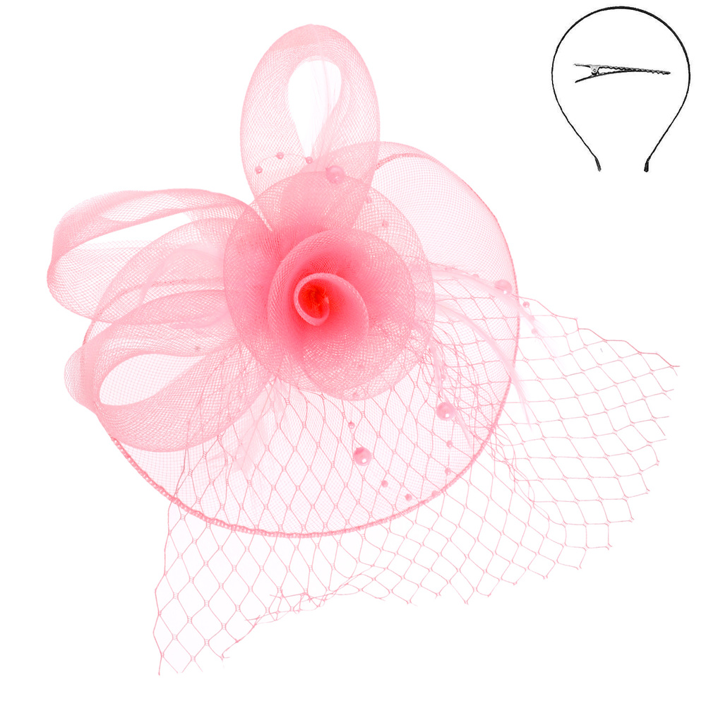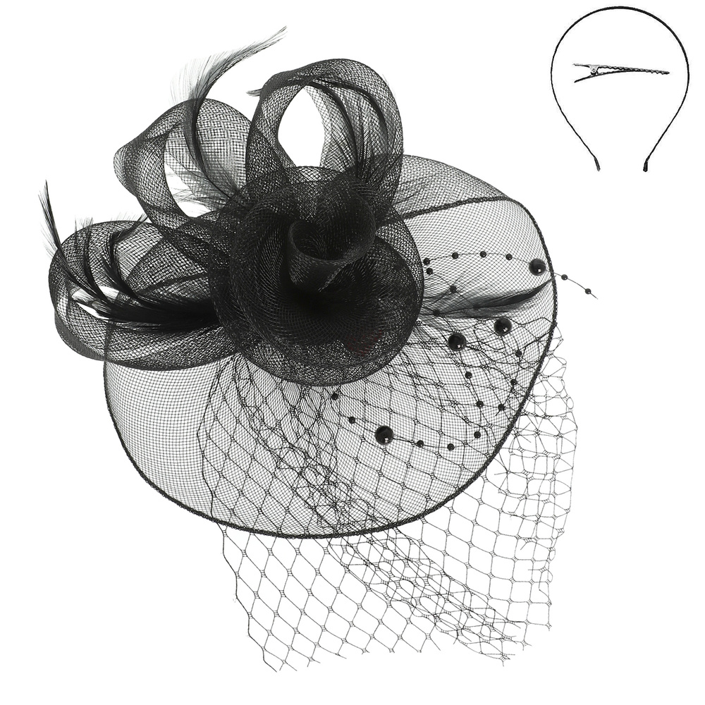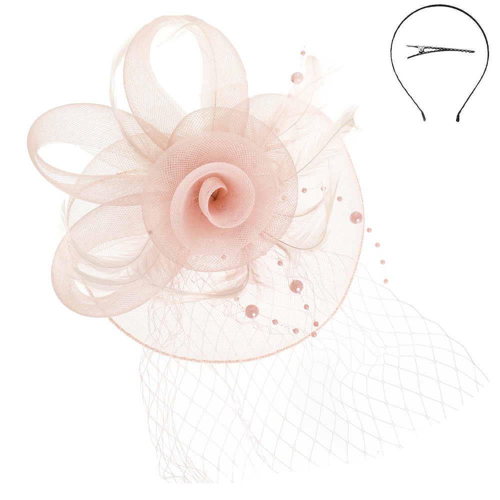 PEARL EMBELLISHED FLORAL FEATHER VEILED FASCINATOR WITH CLIP AND HEADBAND