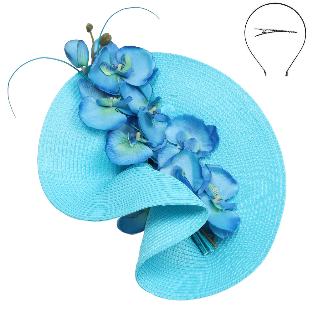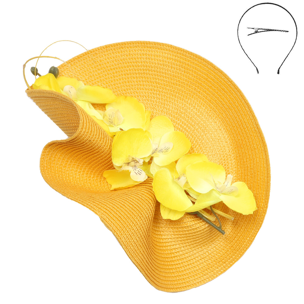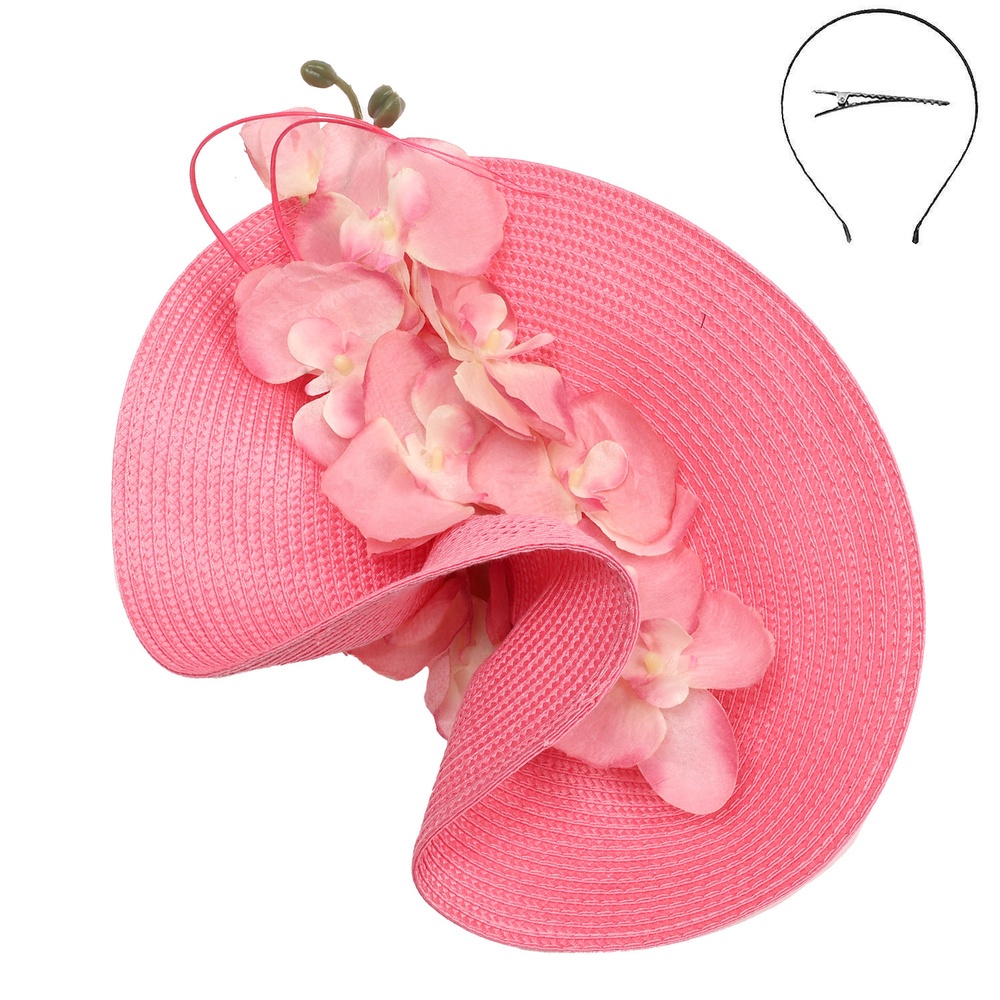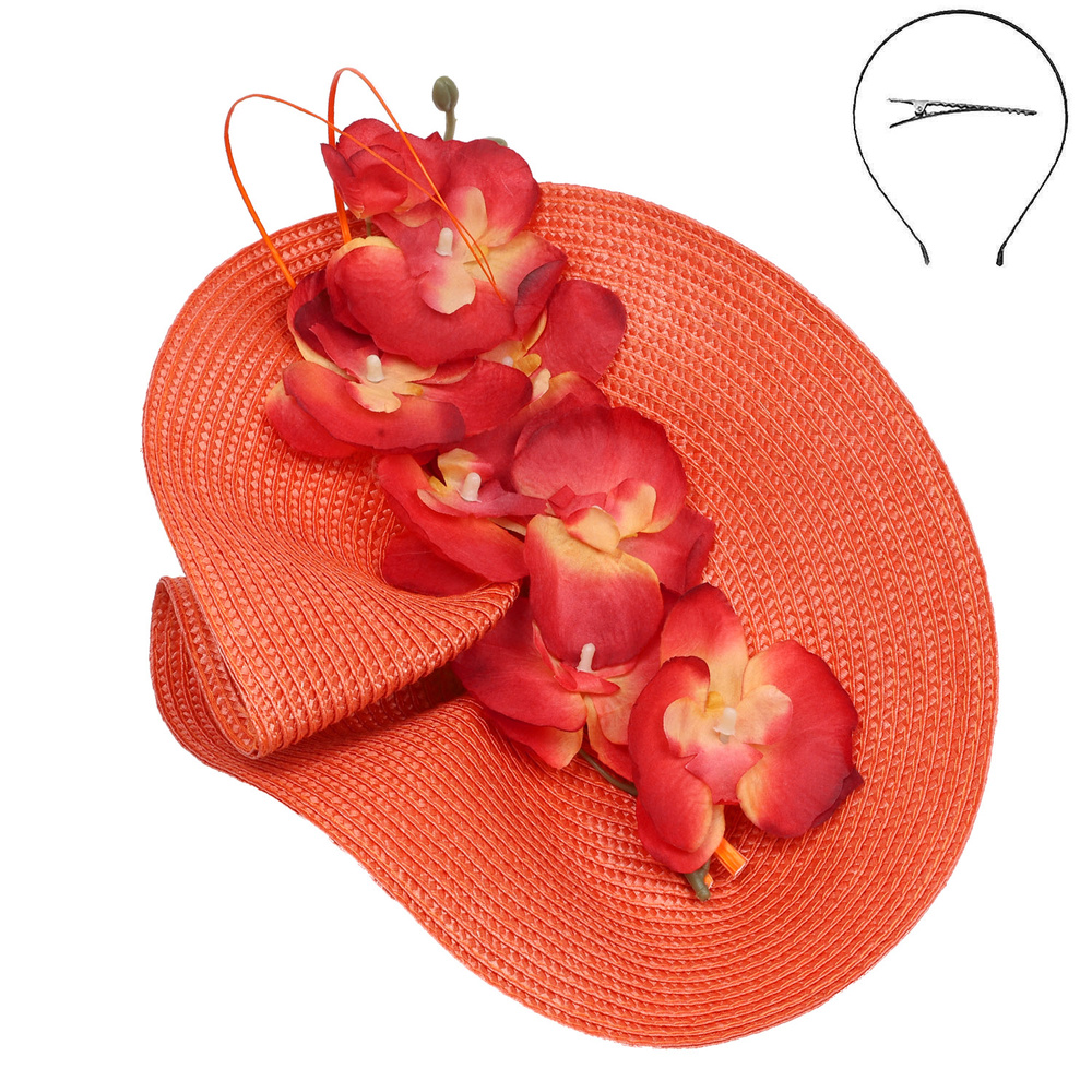 ORCHID BLOSSOM FASCINATOR WITH CURVED BRIM AND WITH CLIP AND HEADBAND ATTACHMENT