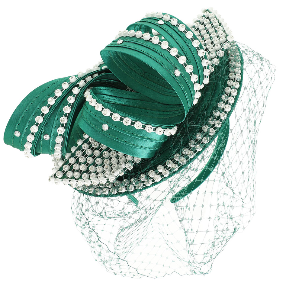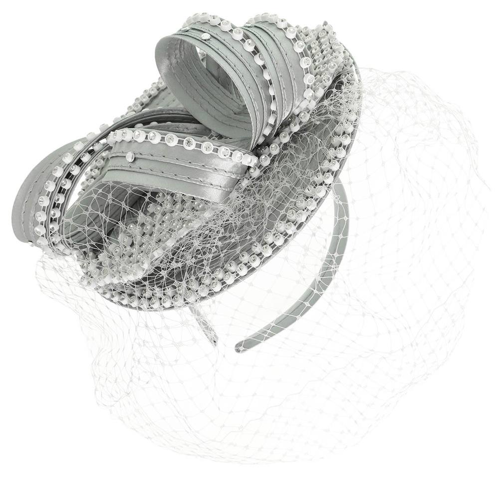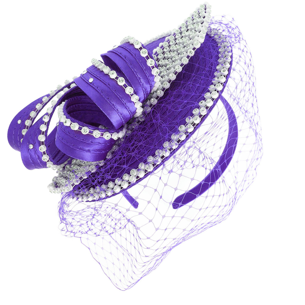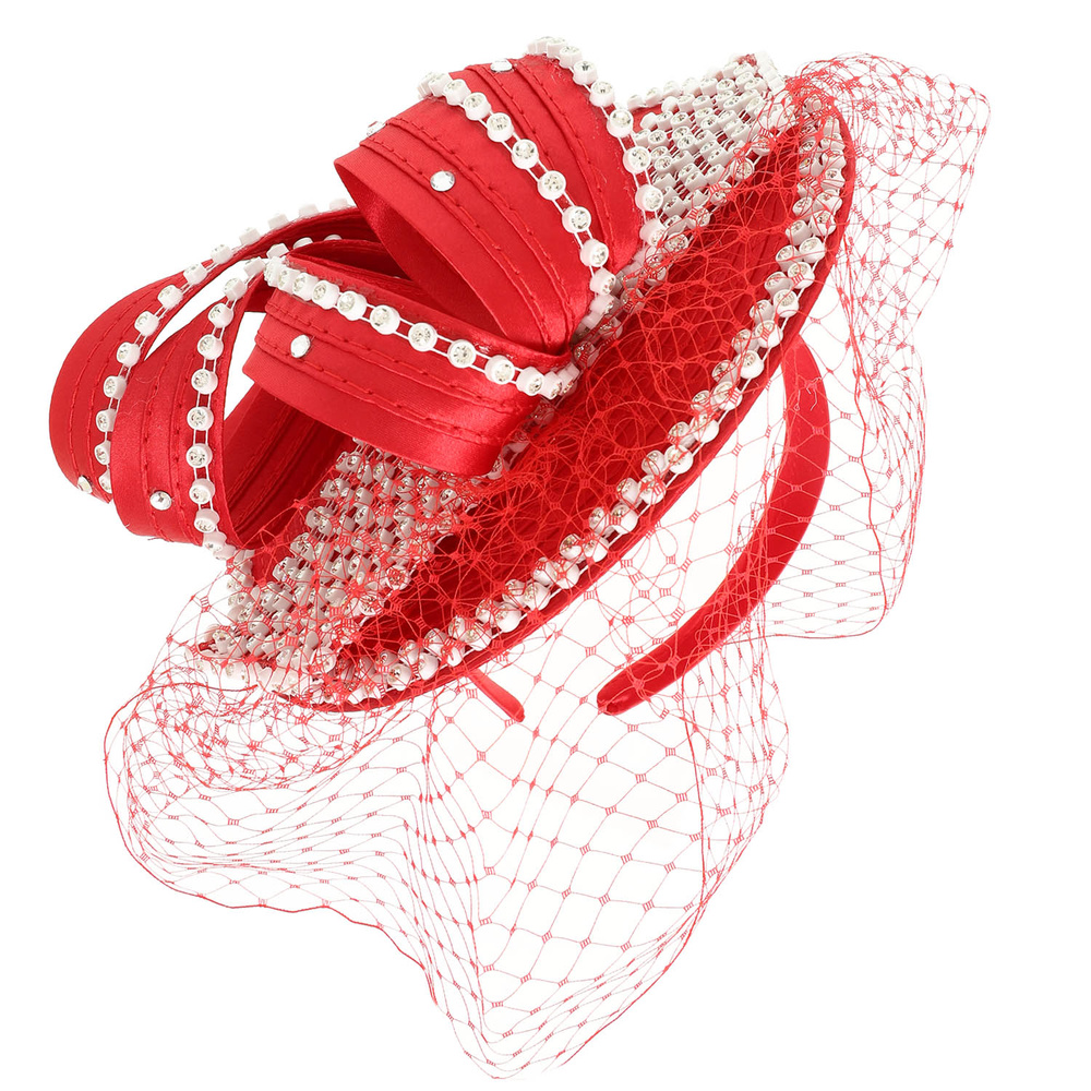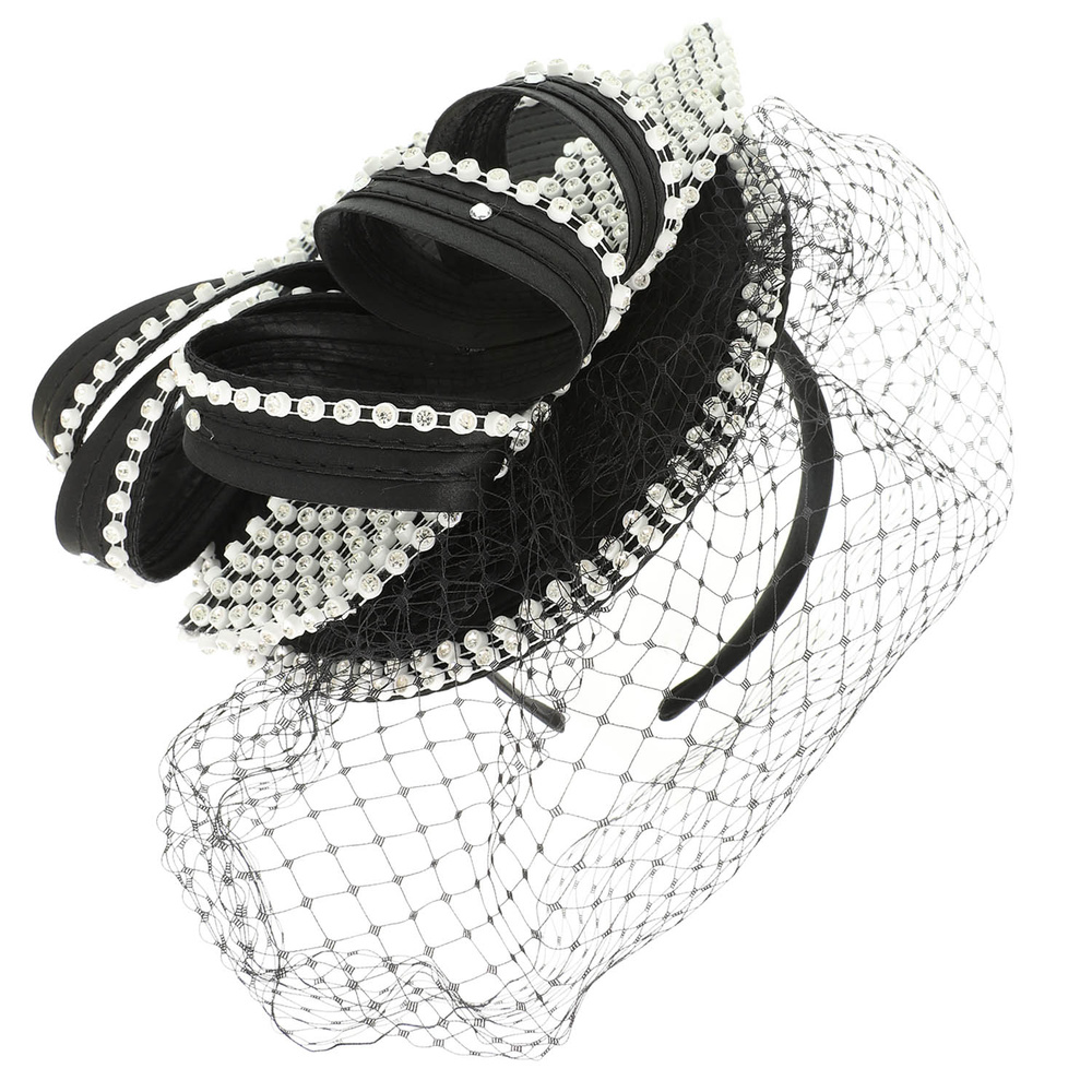 SATIN BOW FASCINATOR WITH CRYSTAL RHINESTONE TRIM AND NET VEIL HEADBAND