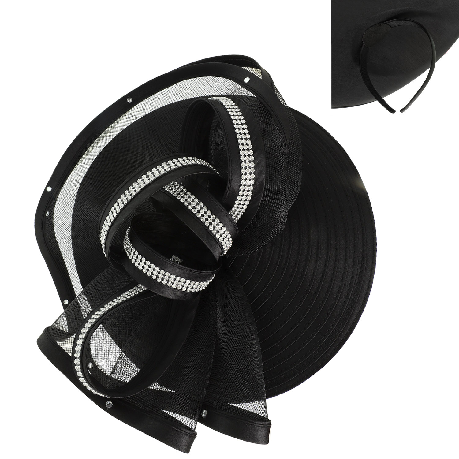 RHINESTONE TRIM SAUCER FASCINATOR WITH DECORATIVE MESH LOOPS AND CRYSTALS ON COMFORT HEADBAND BASE