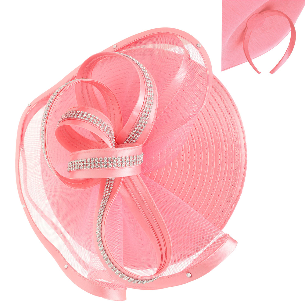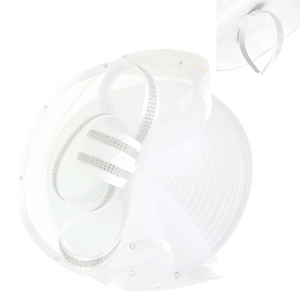 RHINESTONE TRIM SAUCER FASCINATOR WITH DECORATIVE MESH LOOPS AND CRYSTALS ON COMFORT HEADBAND BASE