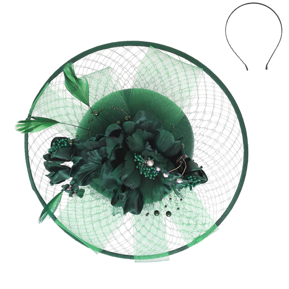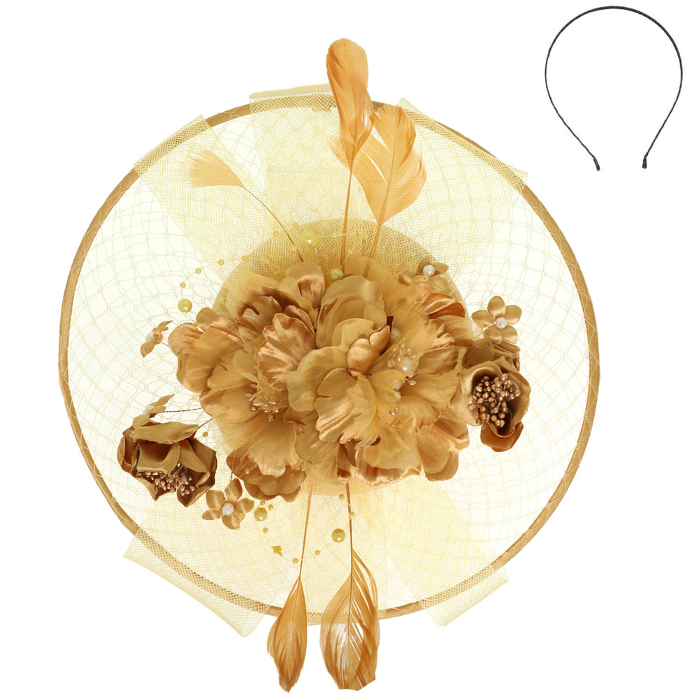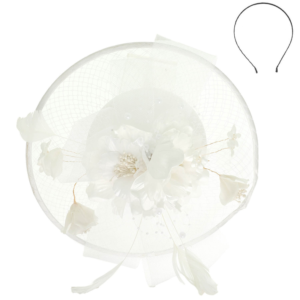 SINAMAY FASCINATOR WITH NET OVERLAY FLORAL BEAD CLUSTERS FEATHER ACCENTS