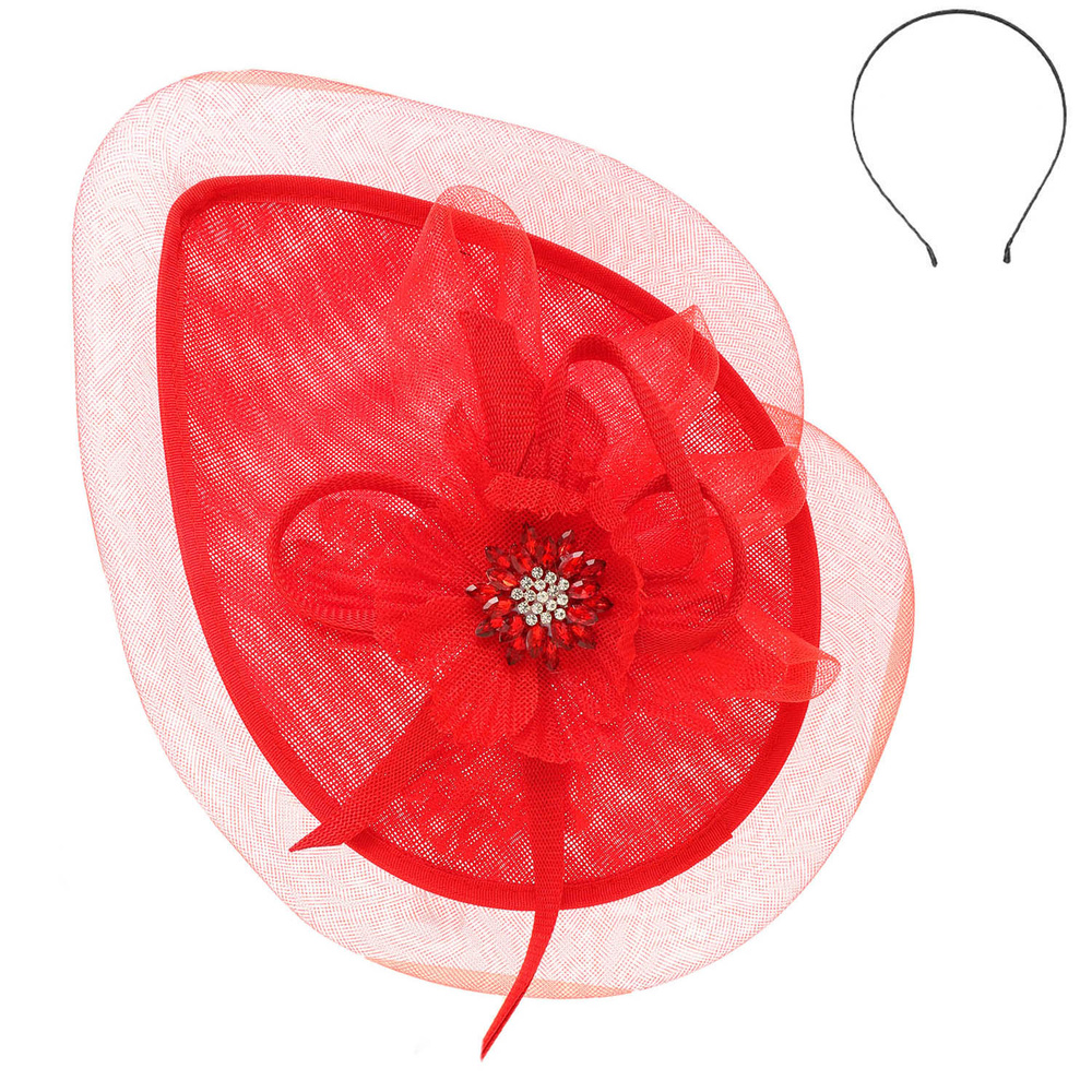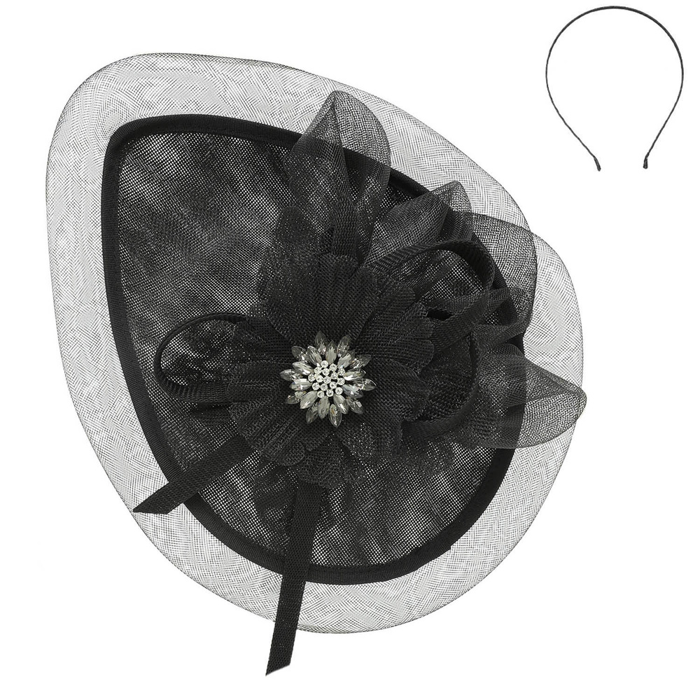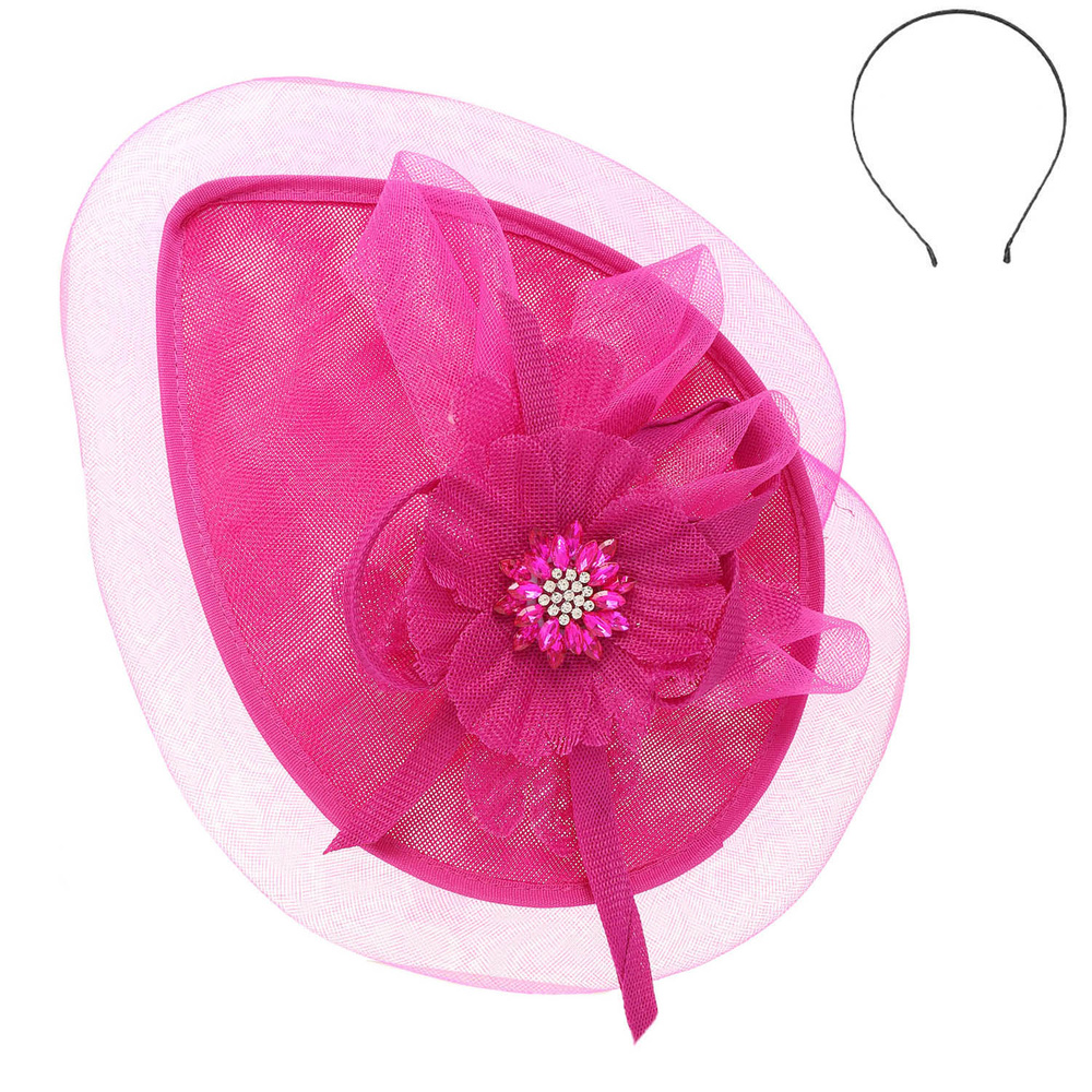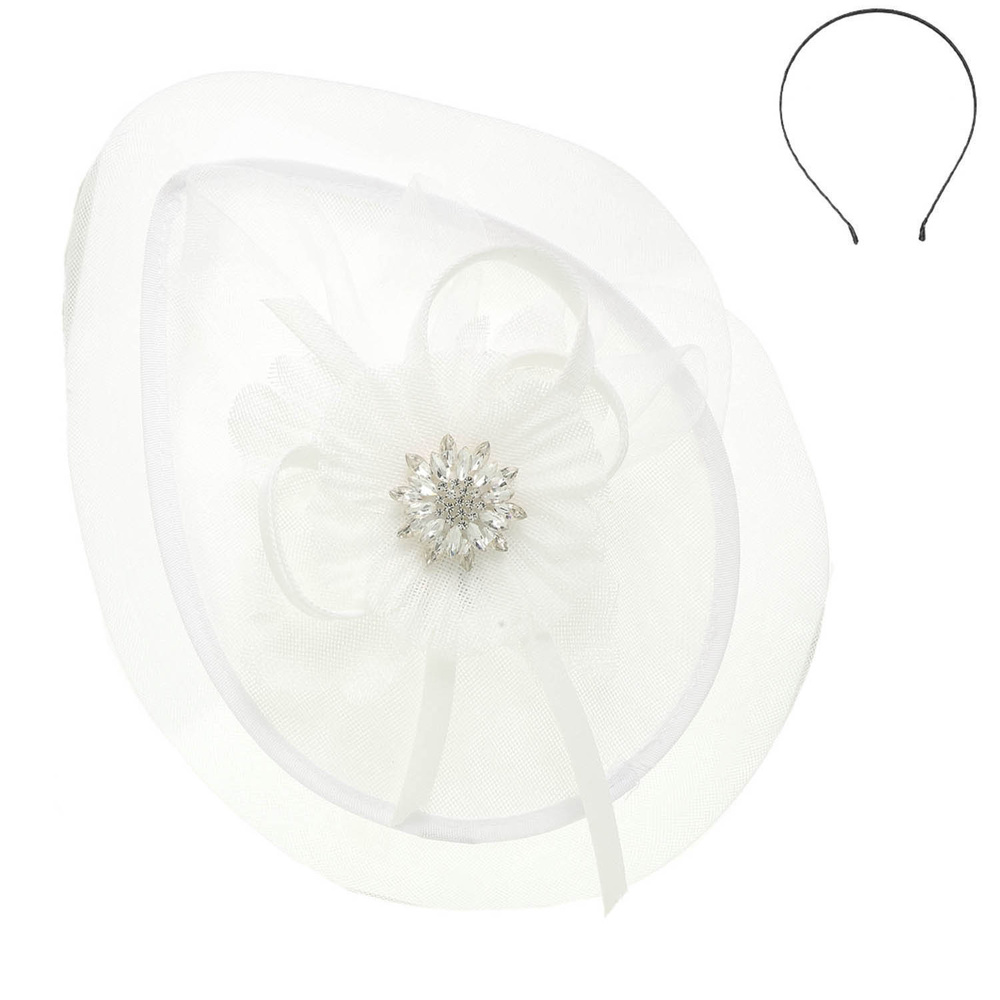 SINAMAY DISC HEADBAND FASCINATOR WITH FLORAL ACCENT AND CRYSTAL RHINESTONE CENTER