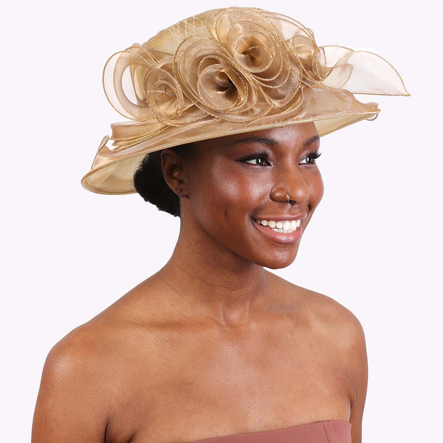 MEDIUM BRIM ORGANZA HAT WITH ROSE CLUSTER