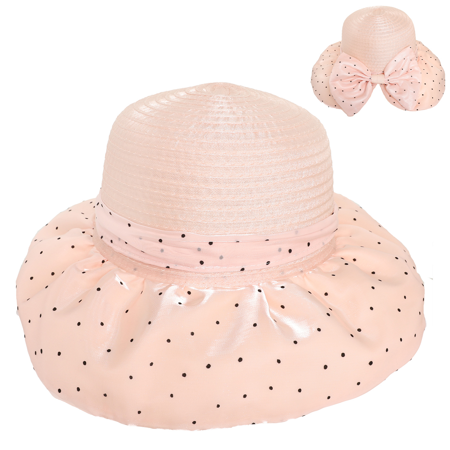 POLKA DOT PLEATED PAPER BRAID RAFFIA BUCKET HAT WITH BOW