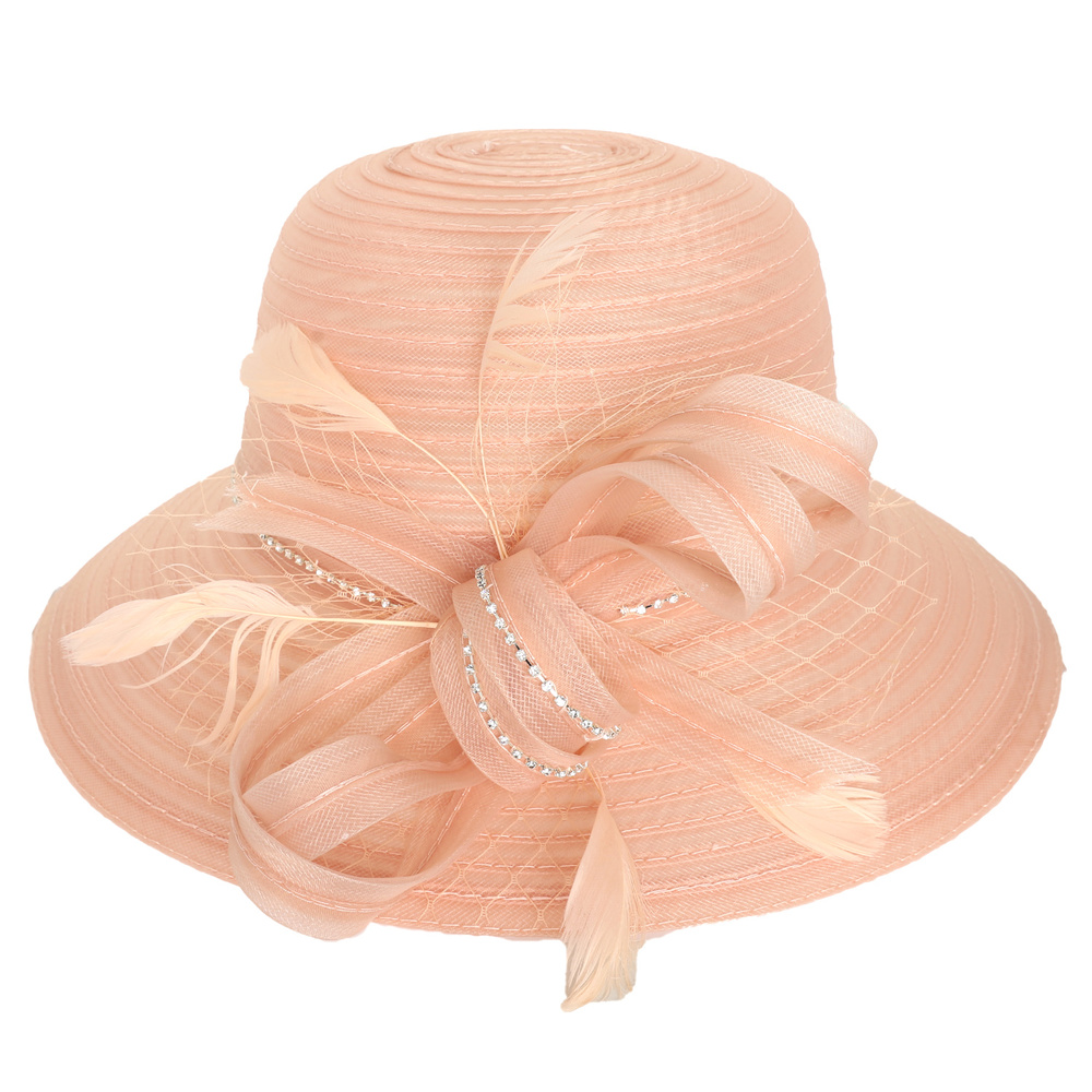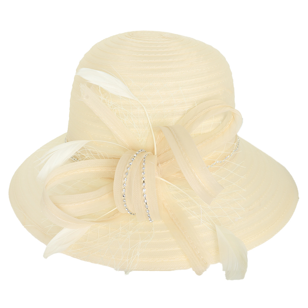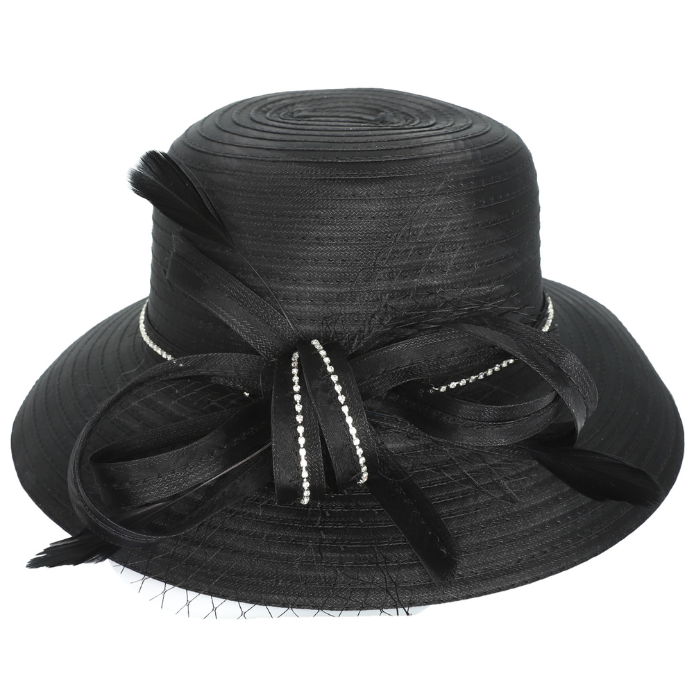 FEATHERED RHINESTONE LACED ORGANZA RIBBON CLOCHE BRAID HAT