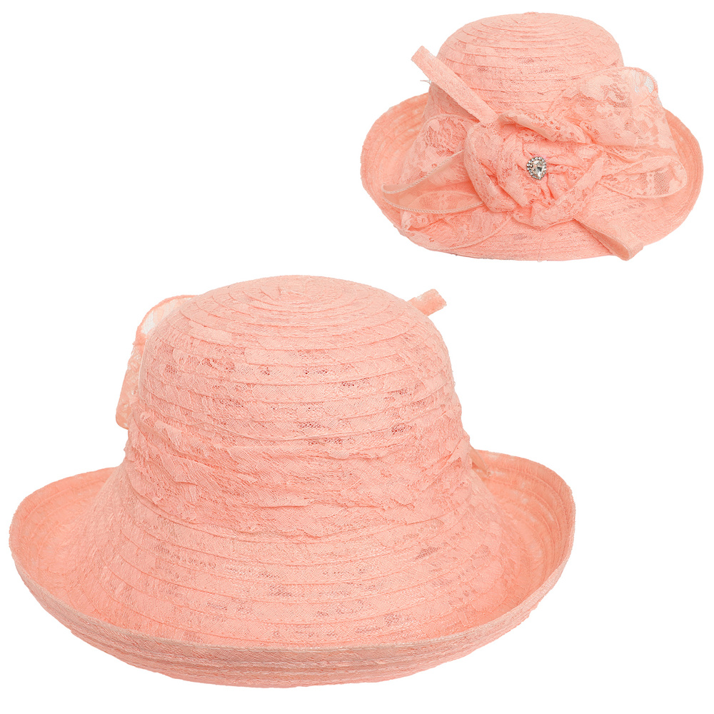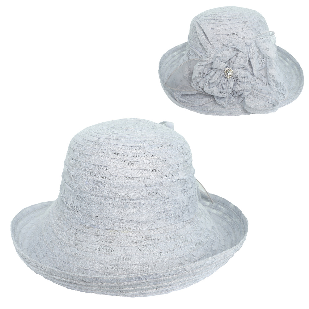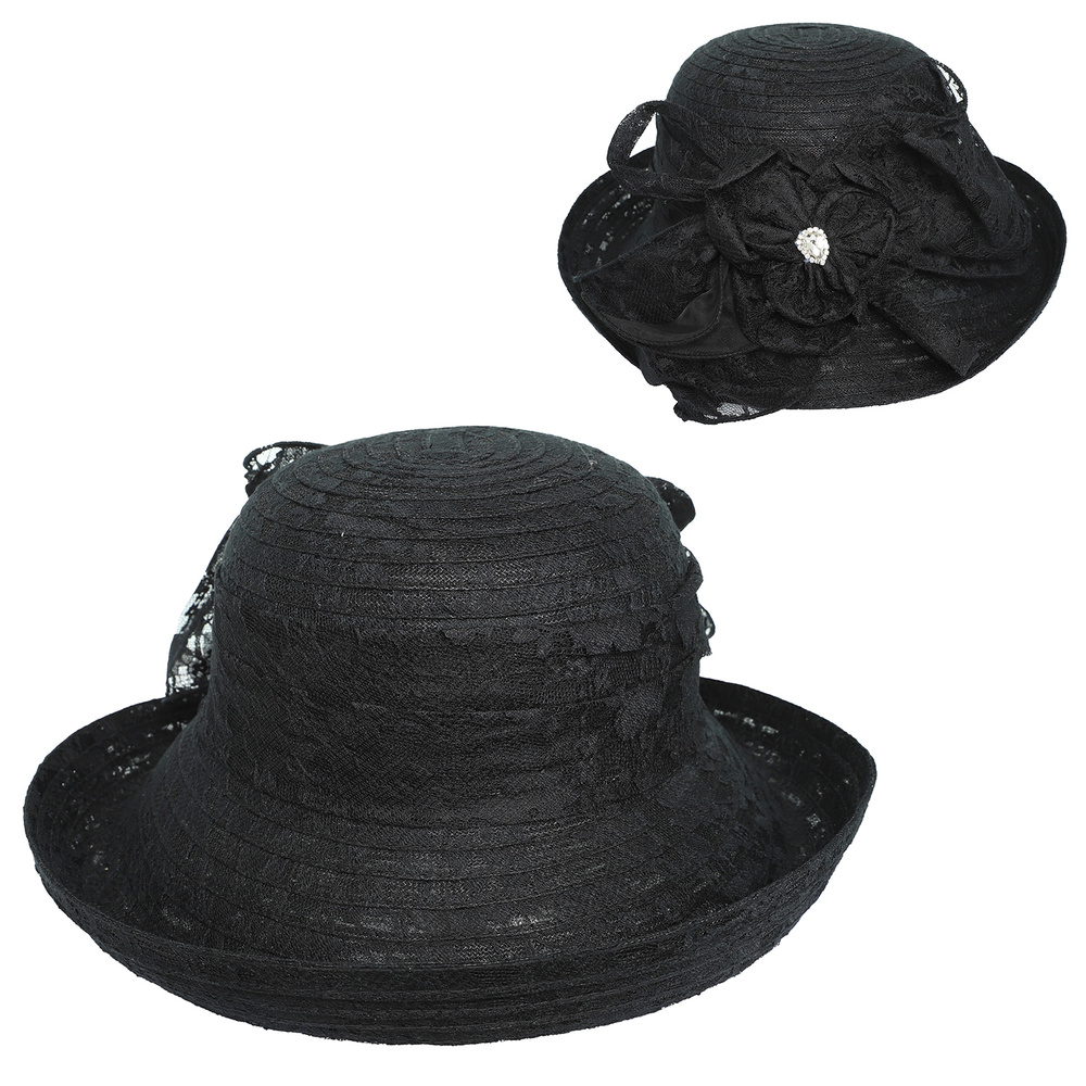 DRESSY GEMSTONE JEWELED UPBRIM LACE BOWLER HAT WITH FLORAL BOW ACCENT
