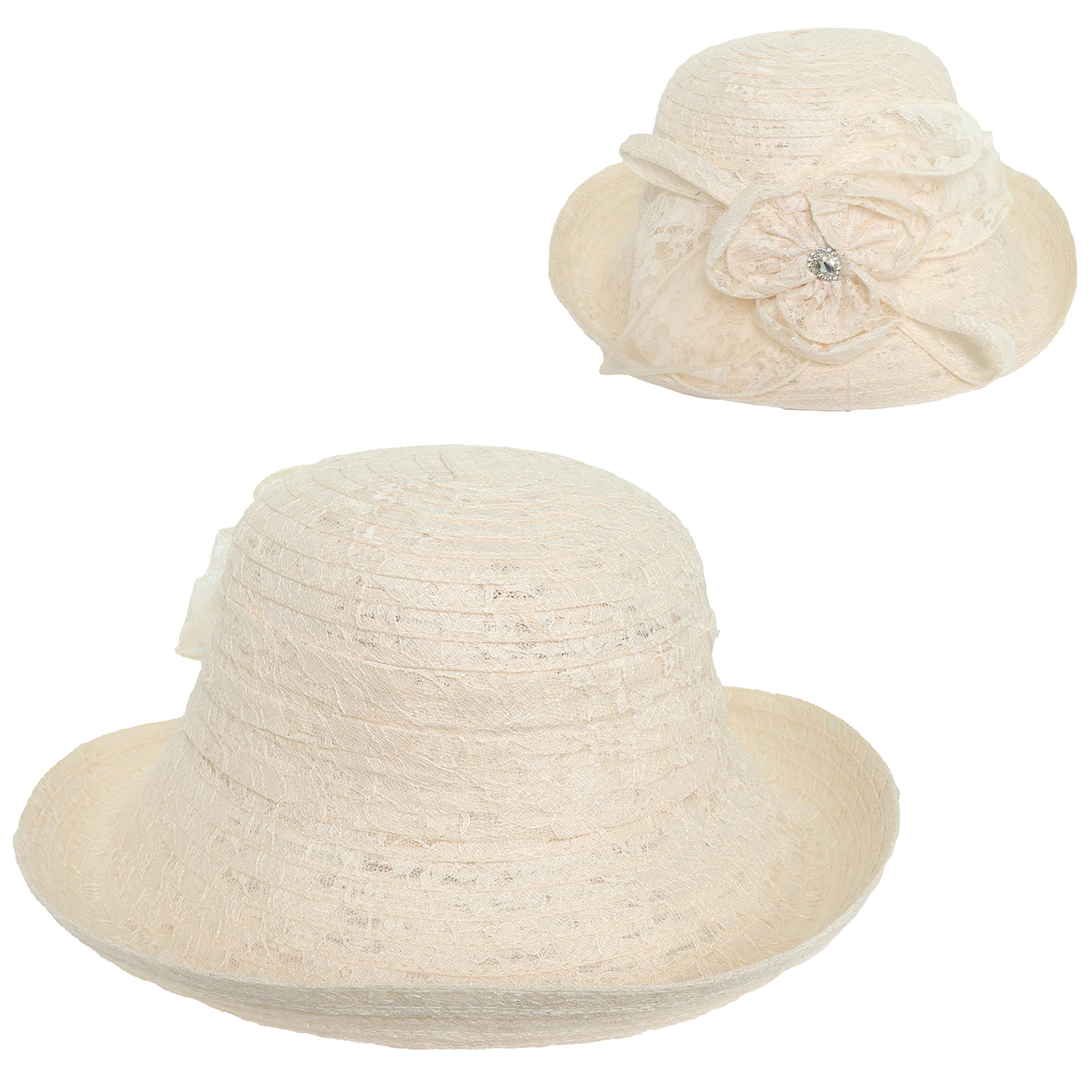 DRESSY GEMSTONE JEWELED UPBRIM LACE BOWLER HAT WITH FLORAL BOW ACCENT