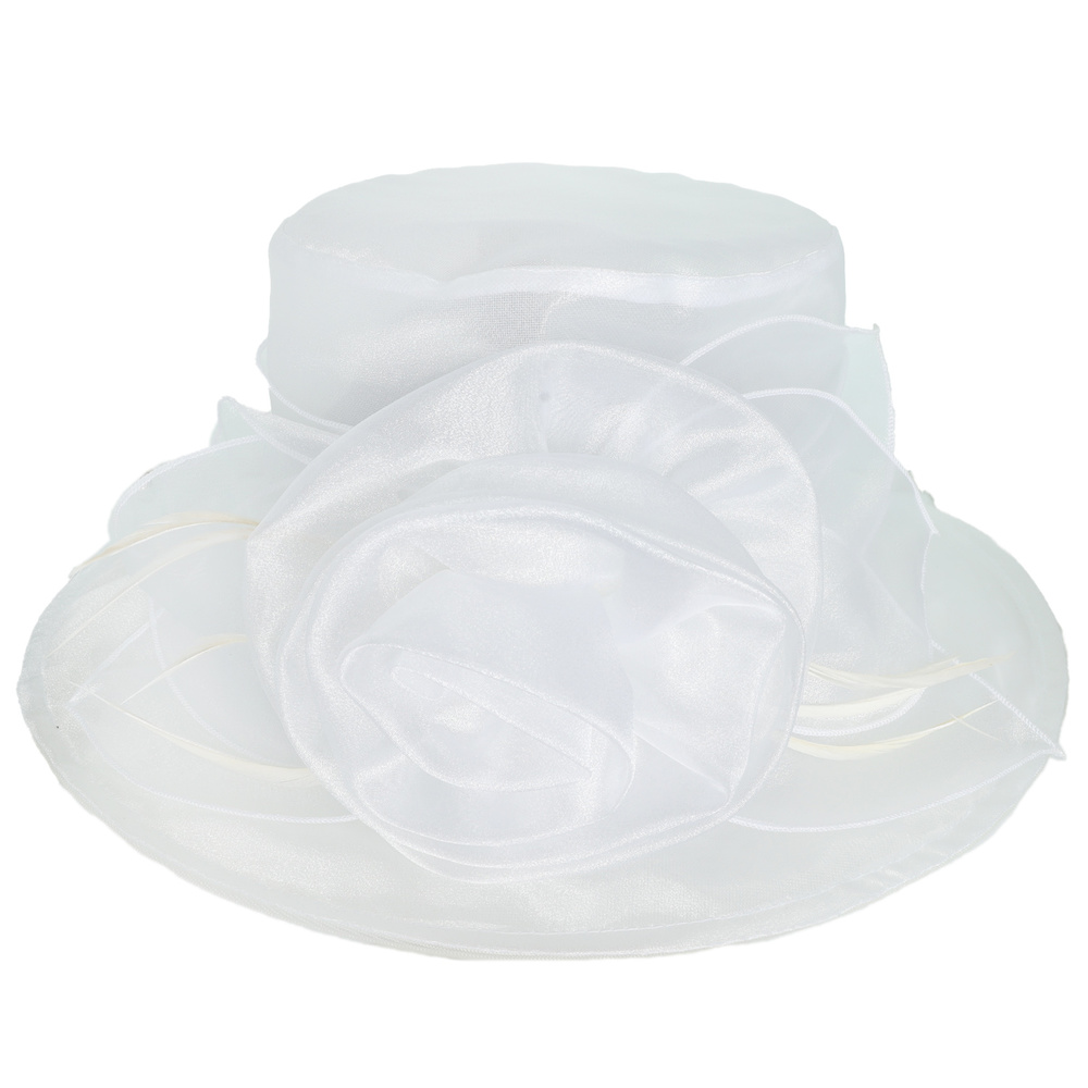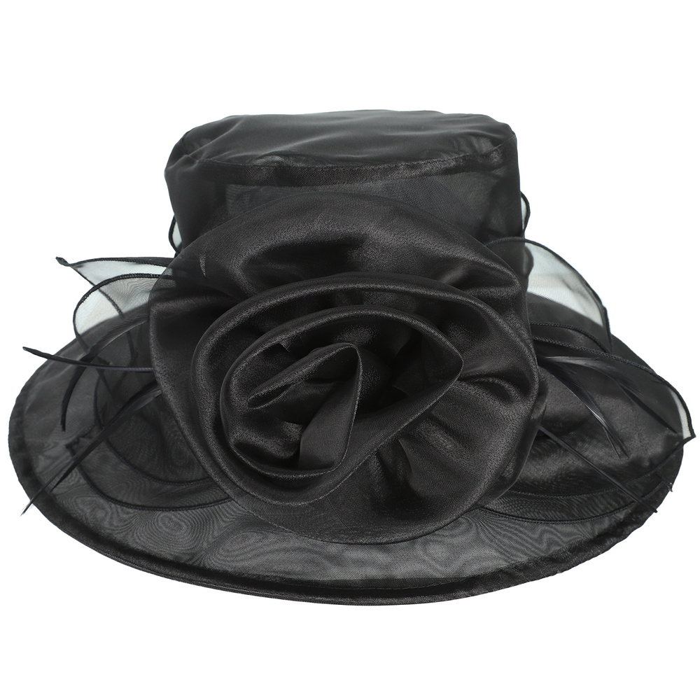 LIGHTWEIGHT FLAT TOP FLORAL ORGANZA HAT WITH FEATHER ACCENT
