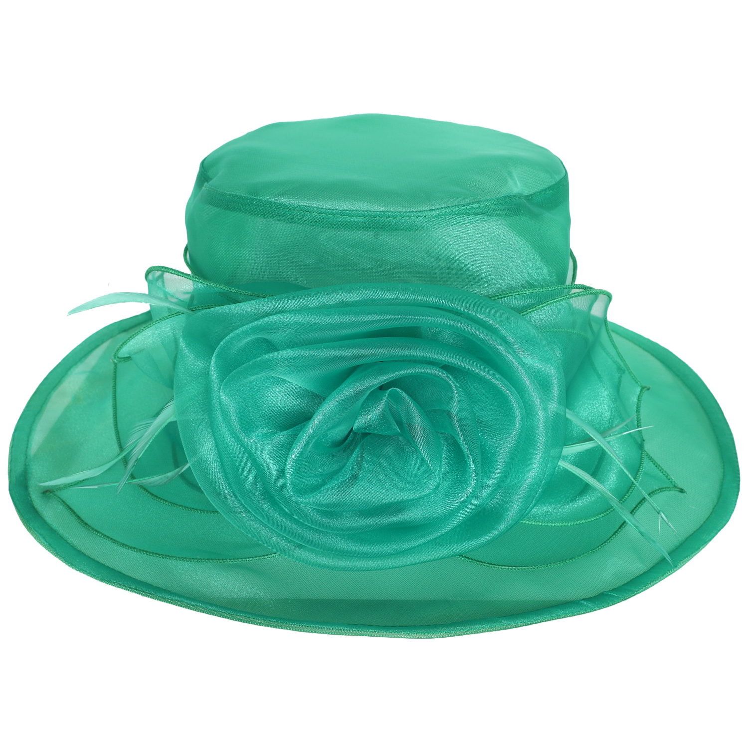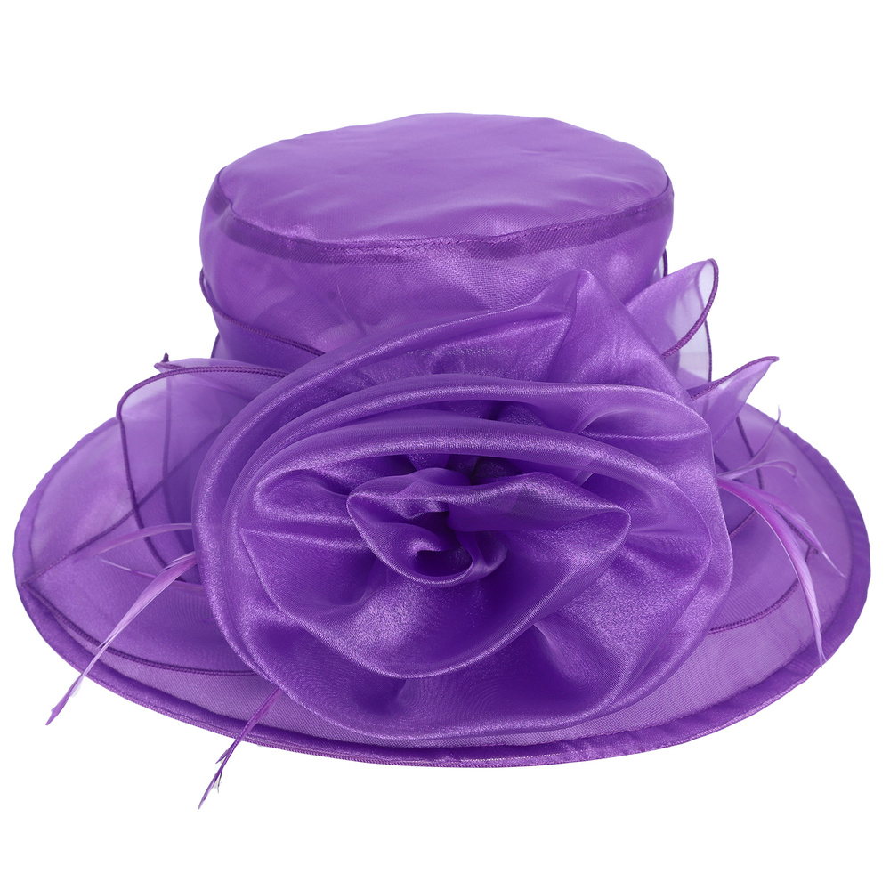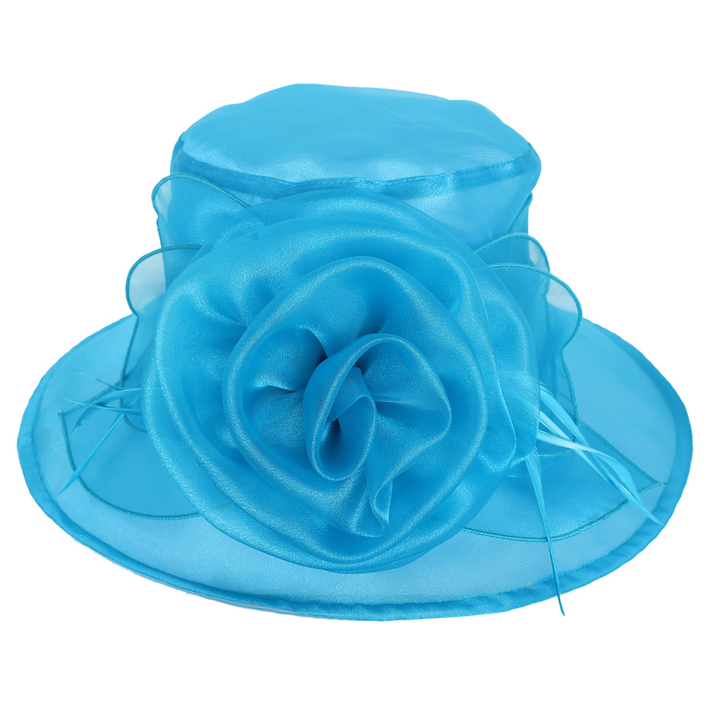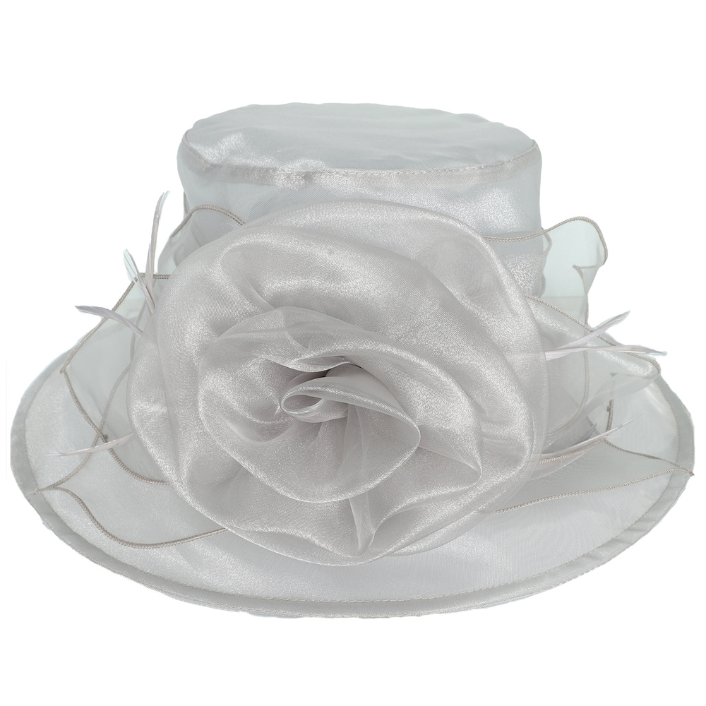 LIGHTWEIGHT FLAT TOP FLORAL ORGANZA HAT WITH FEATHER ACCENT