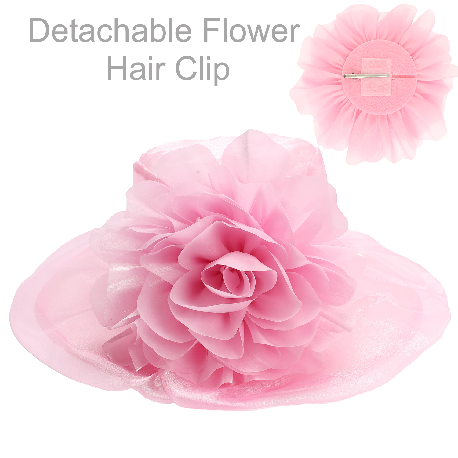 WIDE BRIM ORGANZA HAT WITH DETACHABLE DECORATIVE FASTENED FLORAL FASCINATOR WITH CLIP