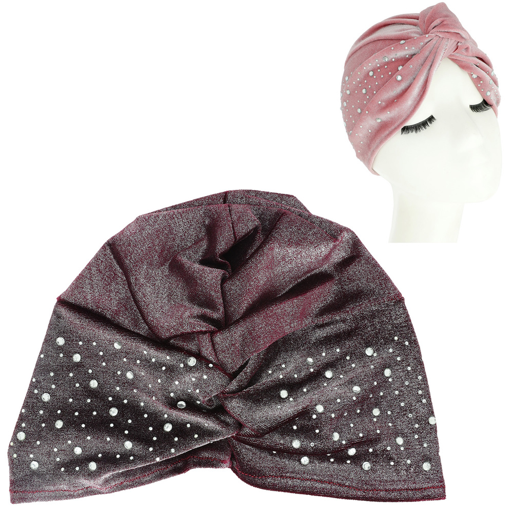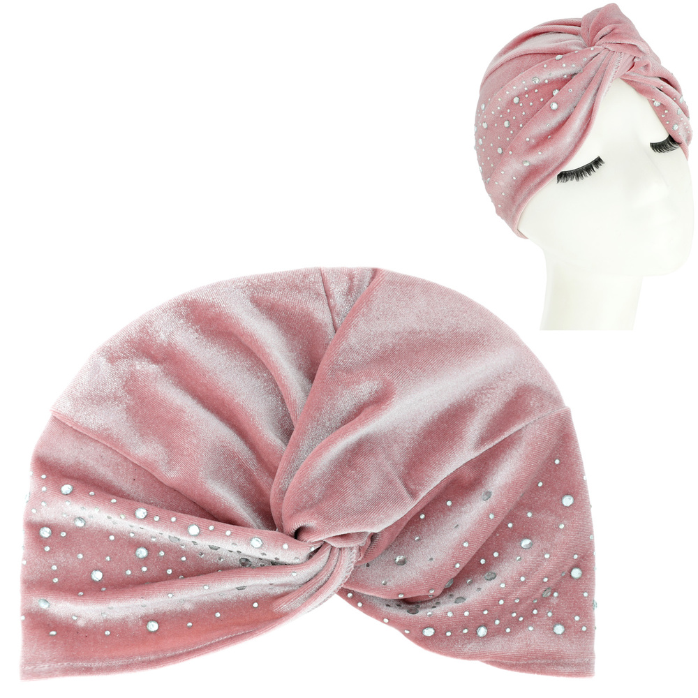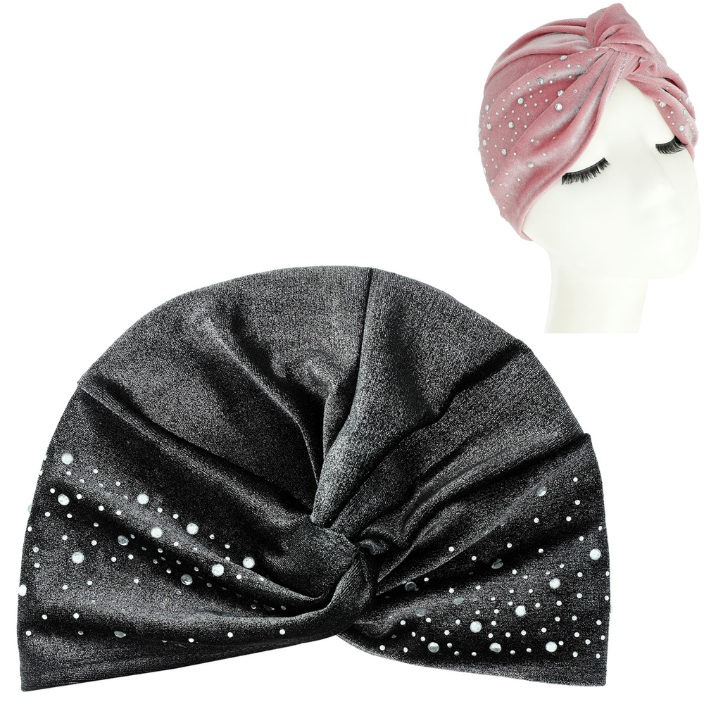 VELVET SOFT PRE TIED KNOT PLEATED TURBAN WITH CRYSTAL RHINESTONE