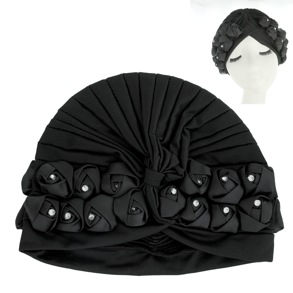 FLORAL CRYSTAL RHINESTONE STUDDED SOLID COLOR FRONT BOW TURBAN HEAD WRAP